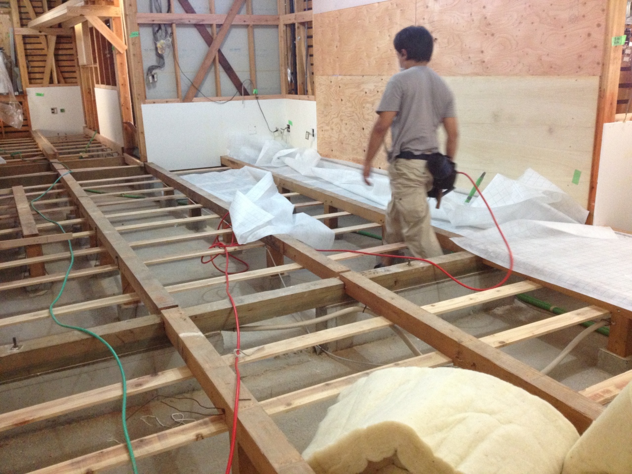 セルロースの床施工を行っています。 大引きといわれる105㎜の角材に上下に不織布を張り セルロースファイバーを充填していきます。