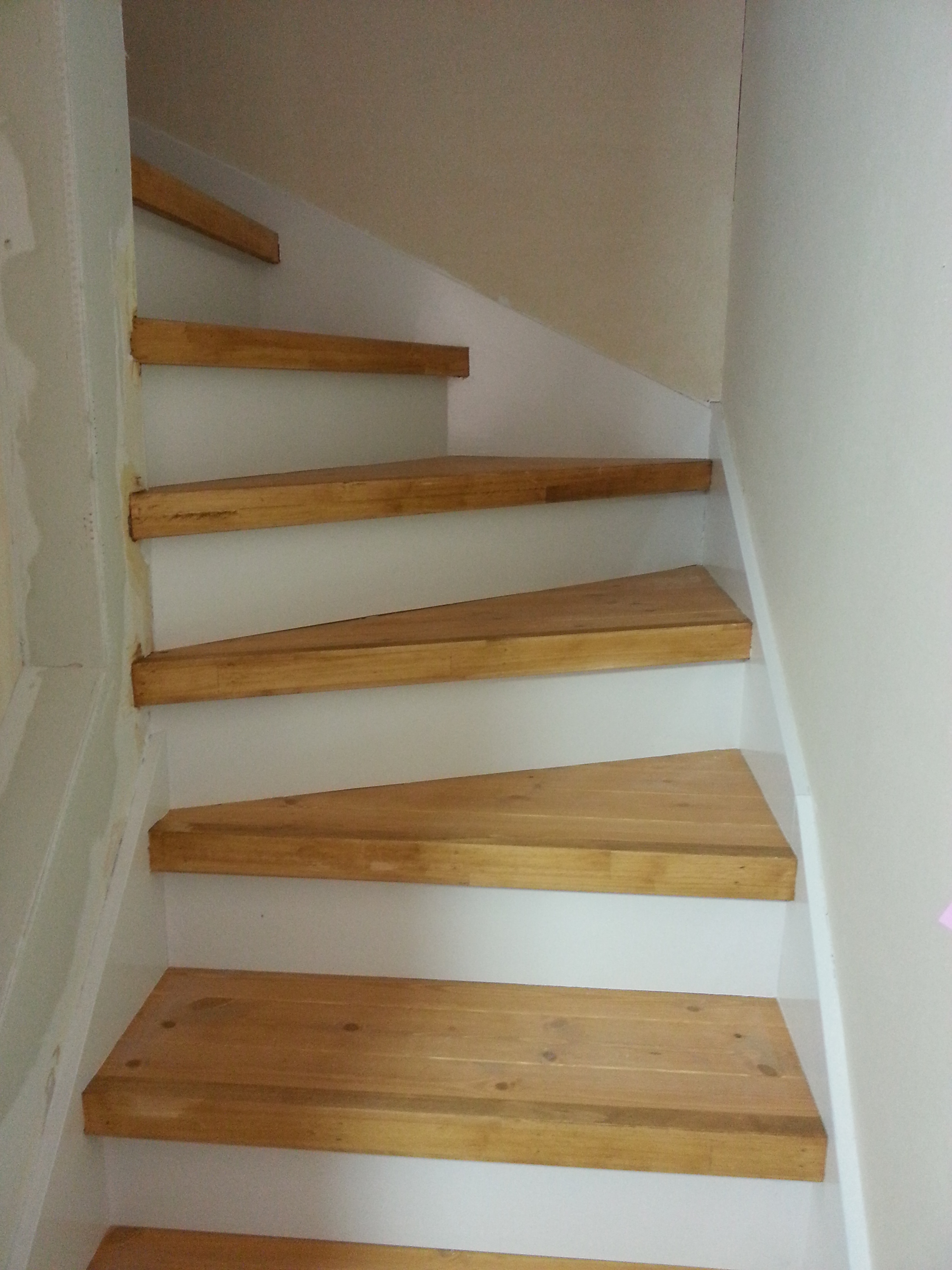 今回は階段の踏み板(文字通り踏むところ)に無垢のパイン材フローリングを貼り、