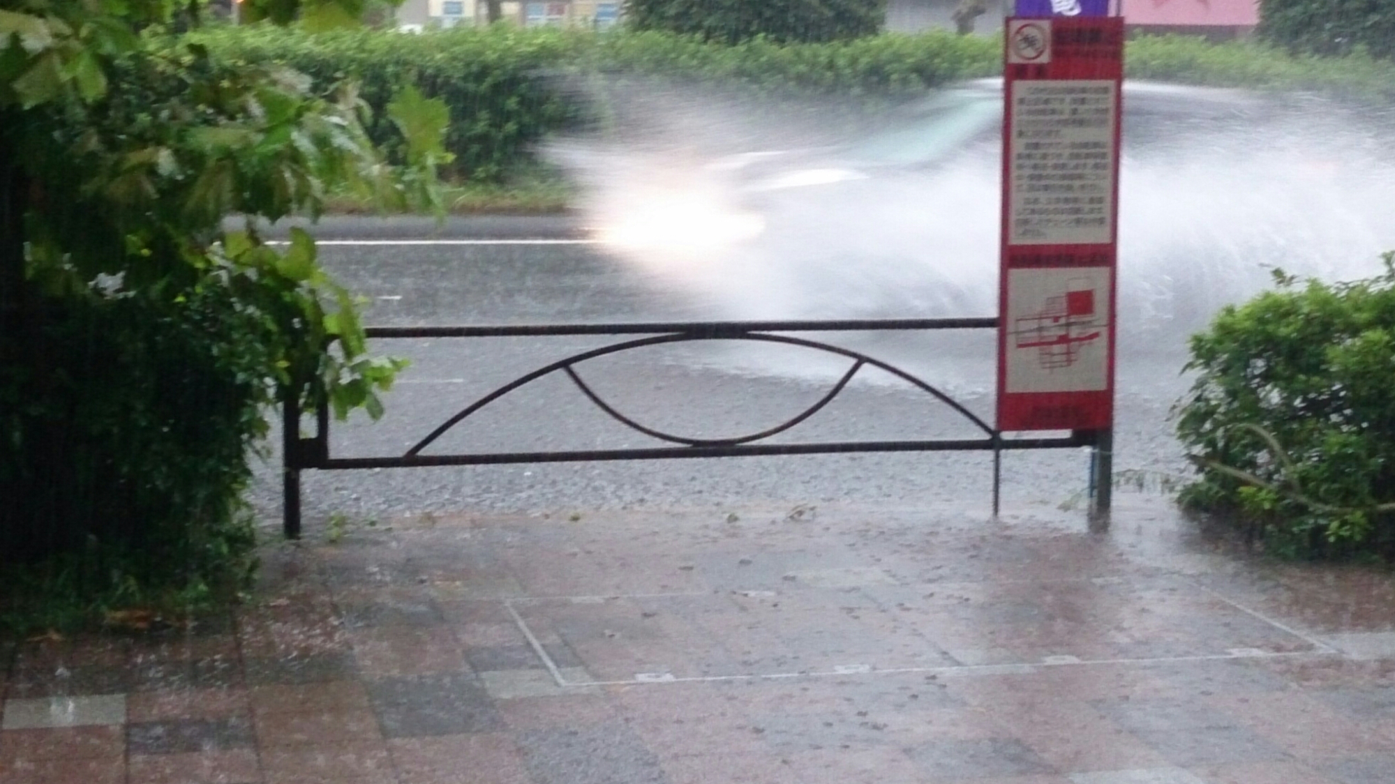 今朝のゲリラ豪雨で、お店の前の道路が雨で溢れています。