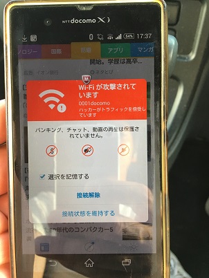 携帯電話のWI-FIが攻撃されている警告表示が出ました。 私を、攻撃しても何も出てこないのに・・・ 初体験だったので、ちょっとドキドキしました。 皆さんも気おつけてください。