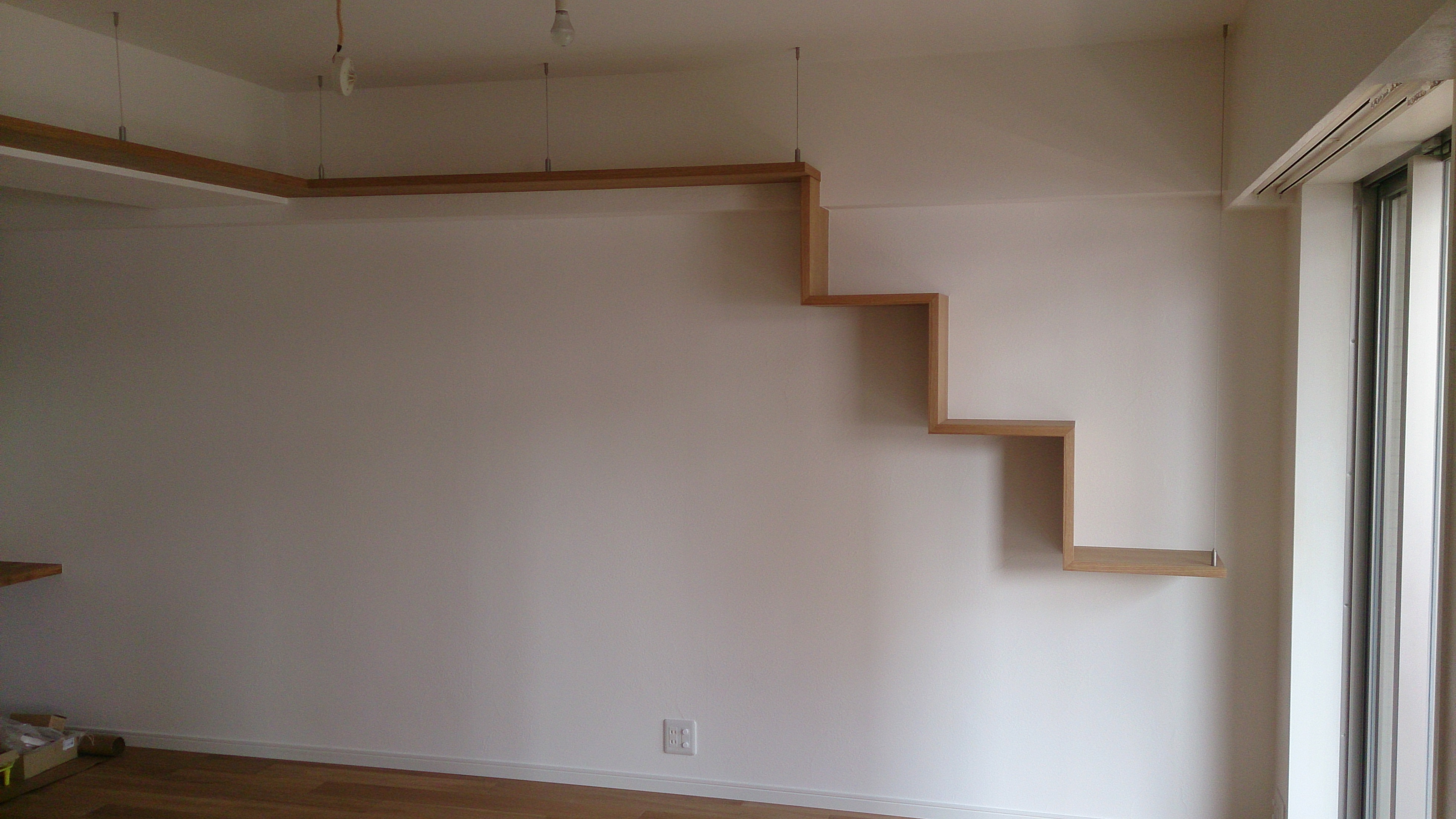 LDの壁に、キャットウォークを新設。 壁に、固定し手前側の部分をワイヤーで吊って施工しました。 階段型の長いCATWALKが出来ました。 遊んでくれる事を、願ってます。