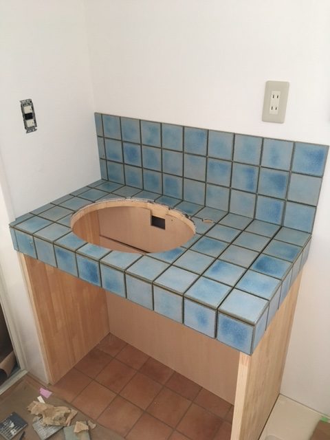 洗面にタイルです、ボール埋め込み部分は最初に穴開け タイルの割り付けは、端に切れ物です。なかなかきれいなタイルでした 次回は完成形を