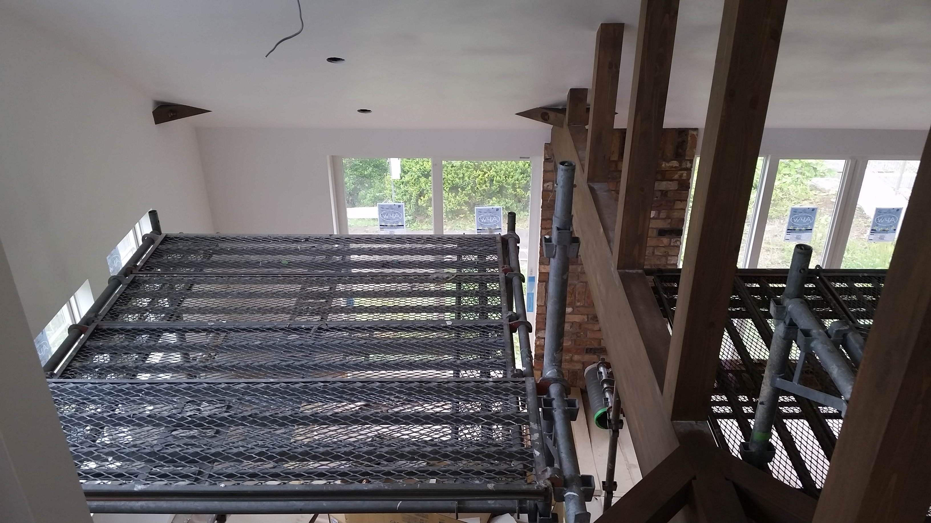吹き抜けの勾配天井を仕上げる為に、内部足場を組んでいます。