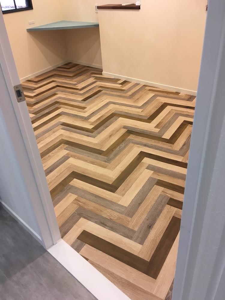 フロアタイルのヘリンボーン張りです!フロアタイルとは思えない仕上がりです。