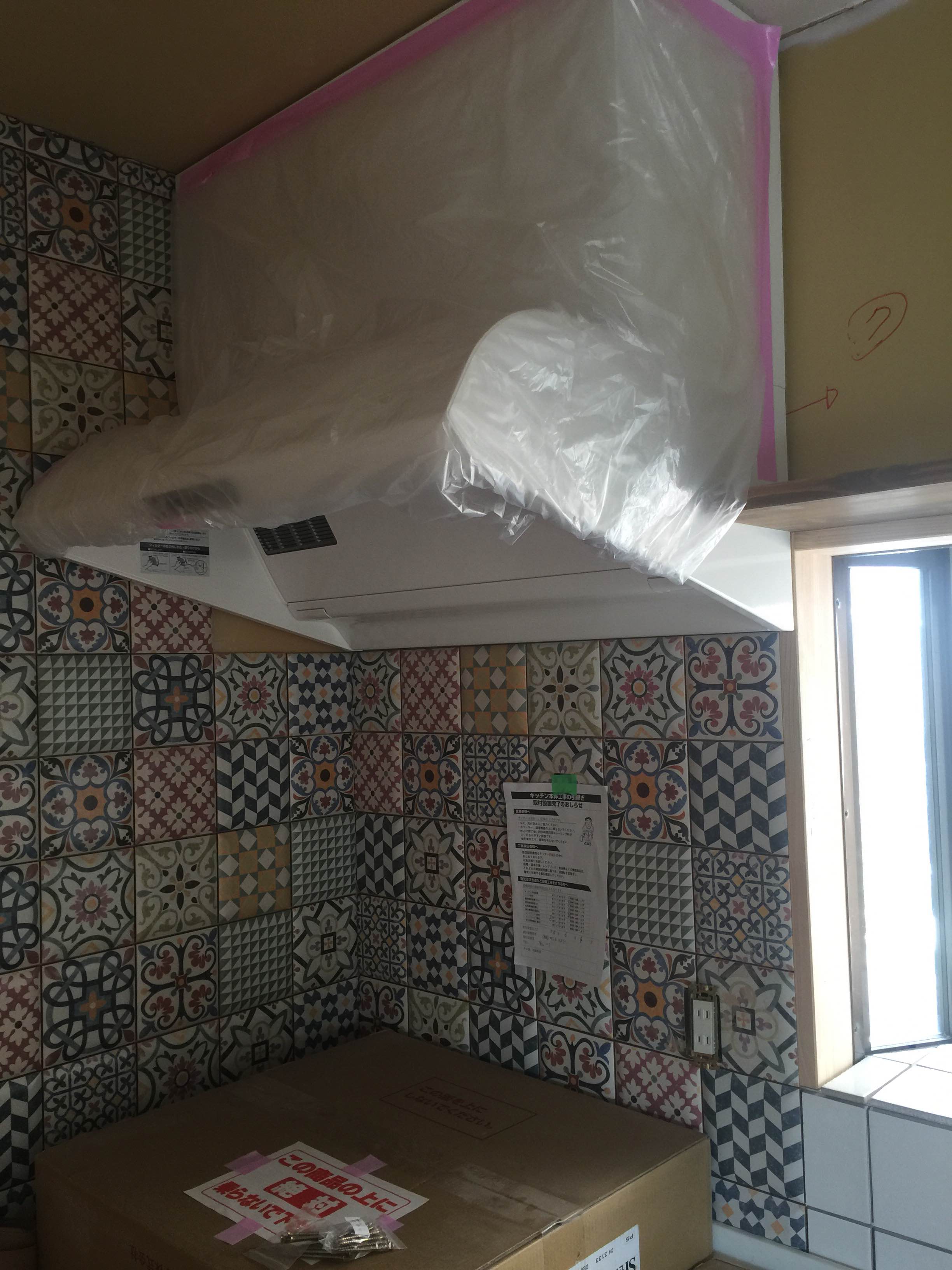 キッチンレンジフード廻りのみアクセントタイルを張りましたよっ☆☆