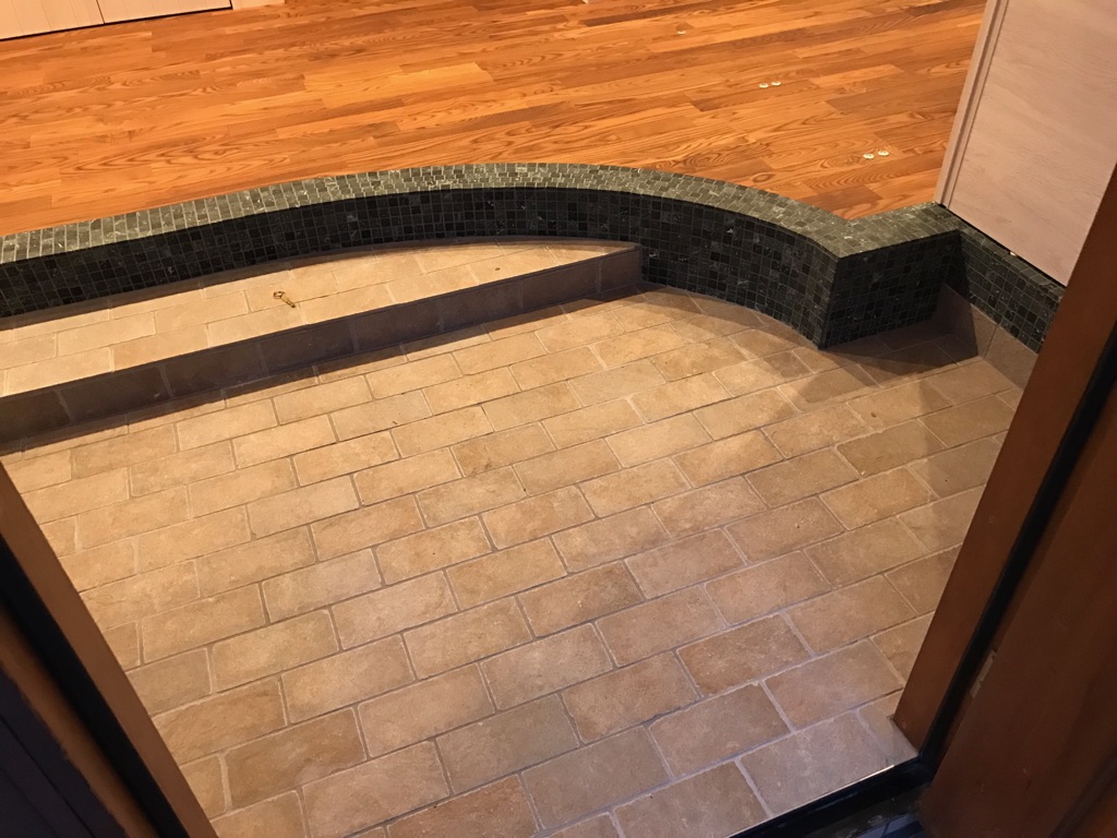 玄関三和土を広げてRの框をモザイクタイルで仕上げましたっ☆☆