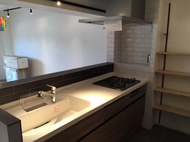 キッチン前にタイルを張りましたよっ☆ 天端も共材で納めています!