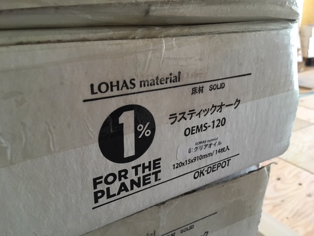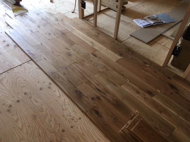 弊社オリジナル建材のラスティックオークの無垢のフロア材を貼っていきます☆☆