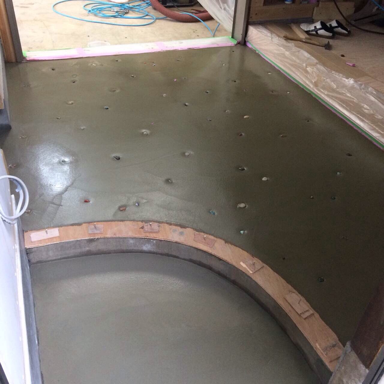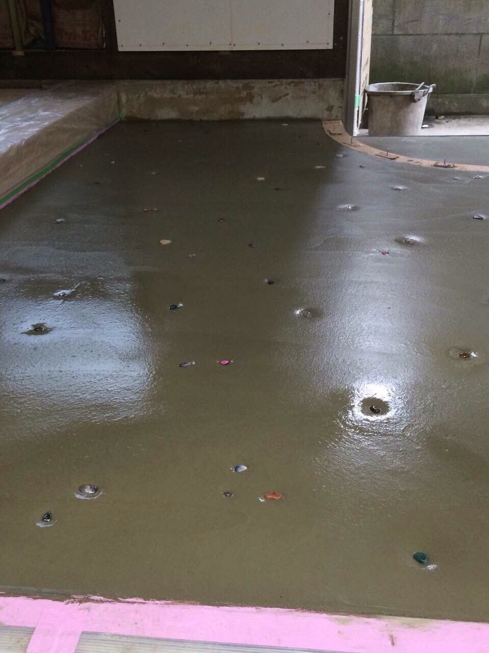 玄関の土間をモルタル仕上げとし、お施主様の希望で思い出の石を埋め込んでいます。框部分をRにしてタイルで仕上げる予定です。