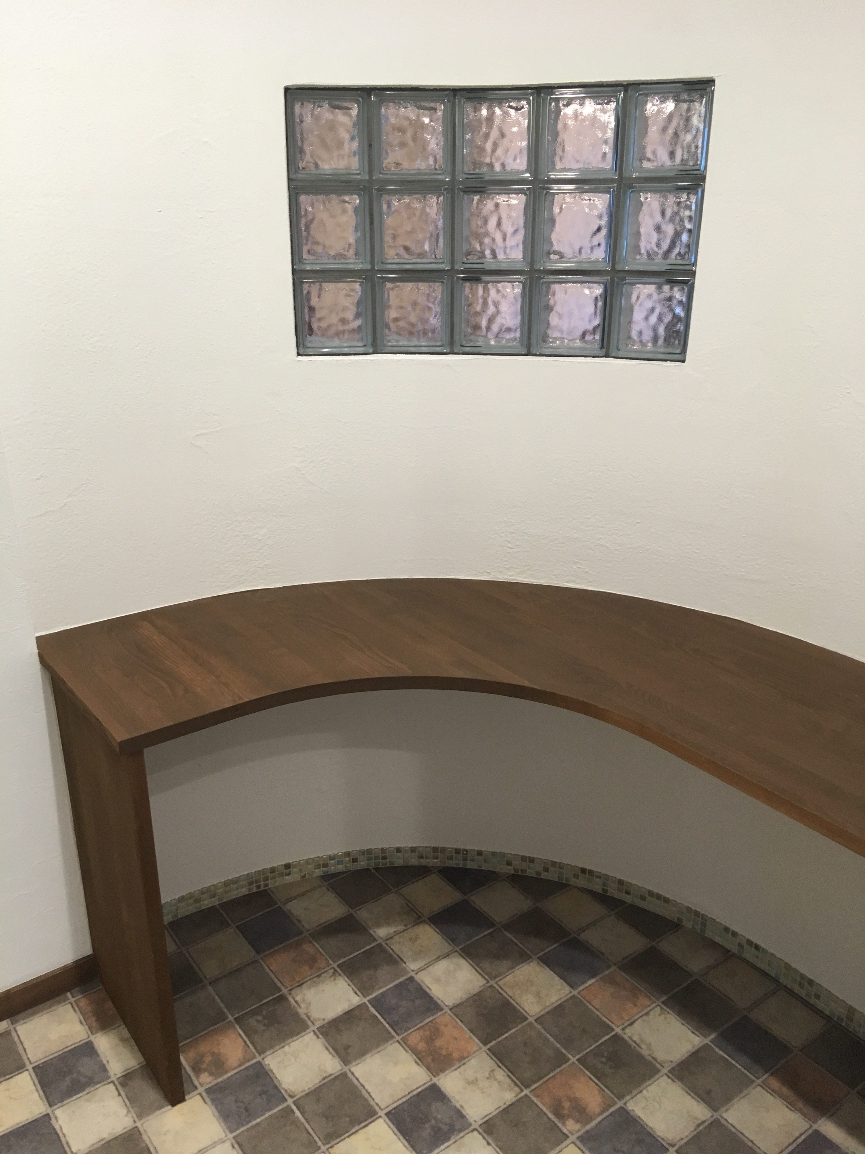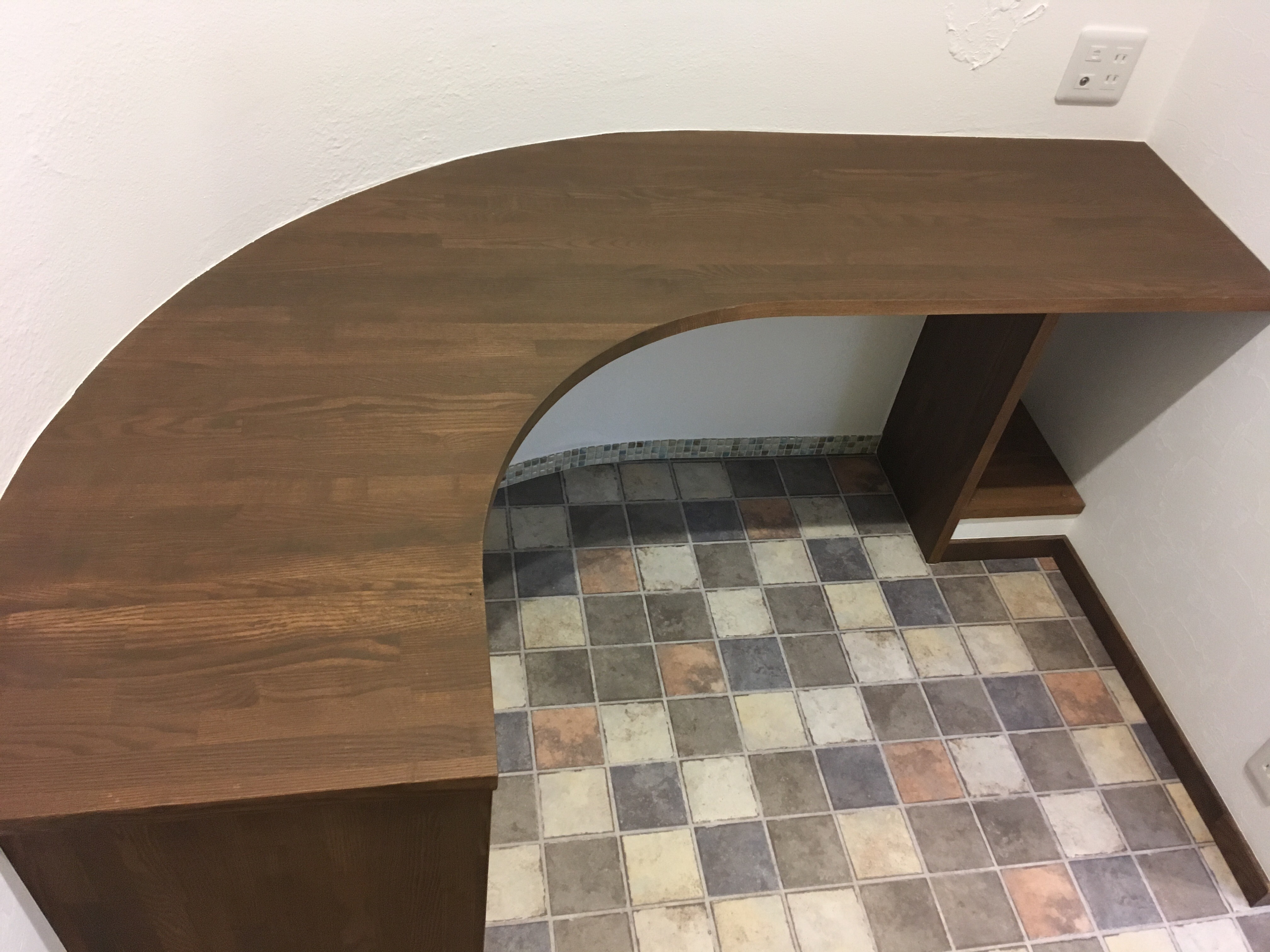 R壁に合わせてデスクカウンターの形状もR天板に造作しています。