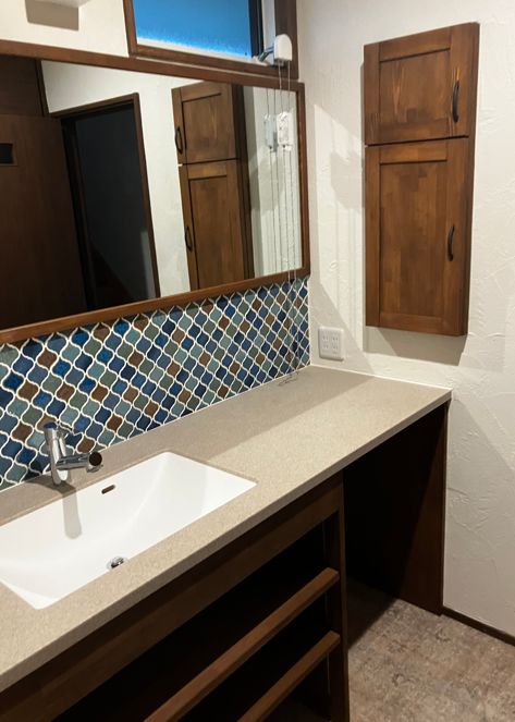 正面にはコラベルのタイルを貼り、上には間口一杯のミラーを設置しました。ミラーが大きいので空間も広く感じられます。