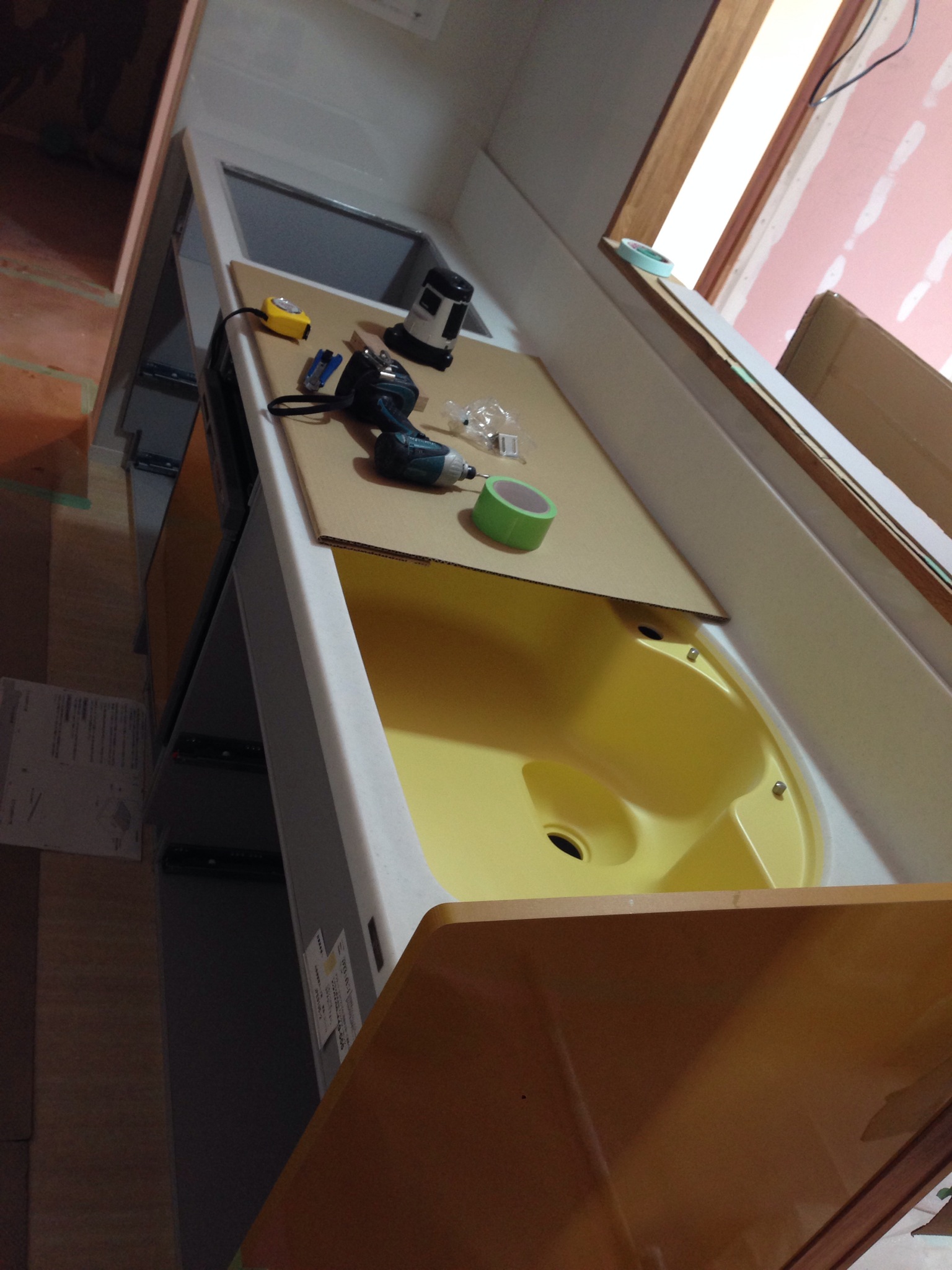 キッチン施工中の写真です。 天板が人造大理石のキッチンです。 レンジフード前は壁を造り、シンク前はオープンになっています。 壁はフードの横幅とピッタリです。