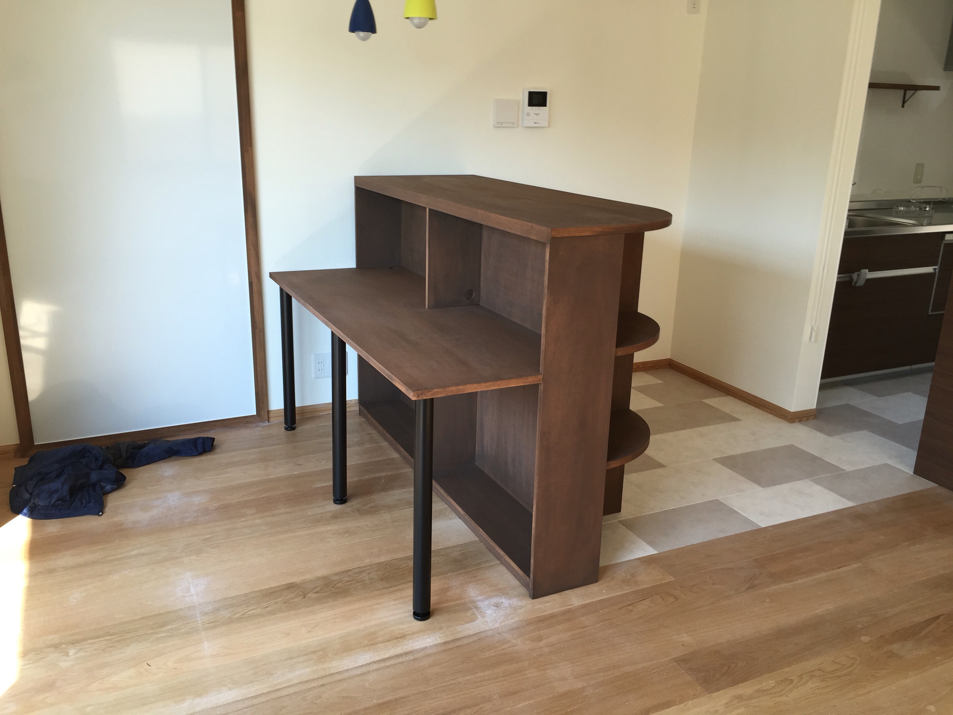 造作家具を設置 引き違いの収納の裏にはオーブンのテーブル 収納力はかなりあります。