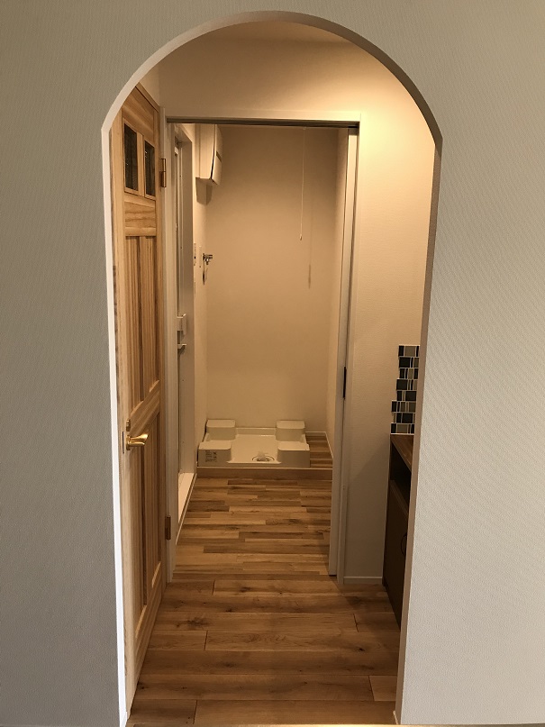 鏡に映ってるのはトイレの無垢扉(アッシュ材ロハスOILホワイト色)