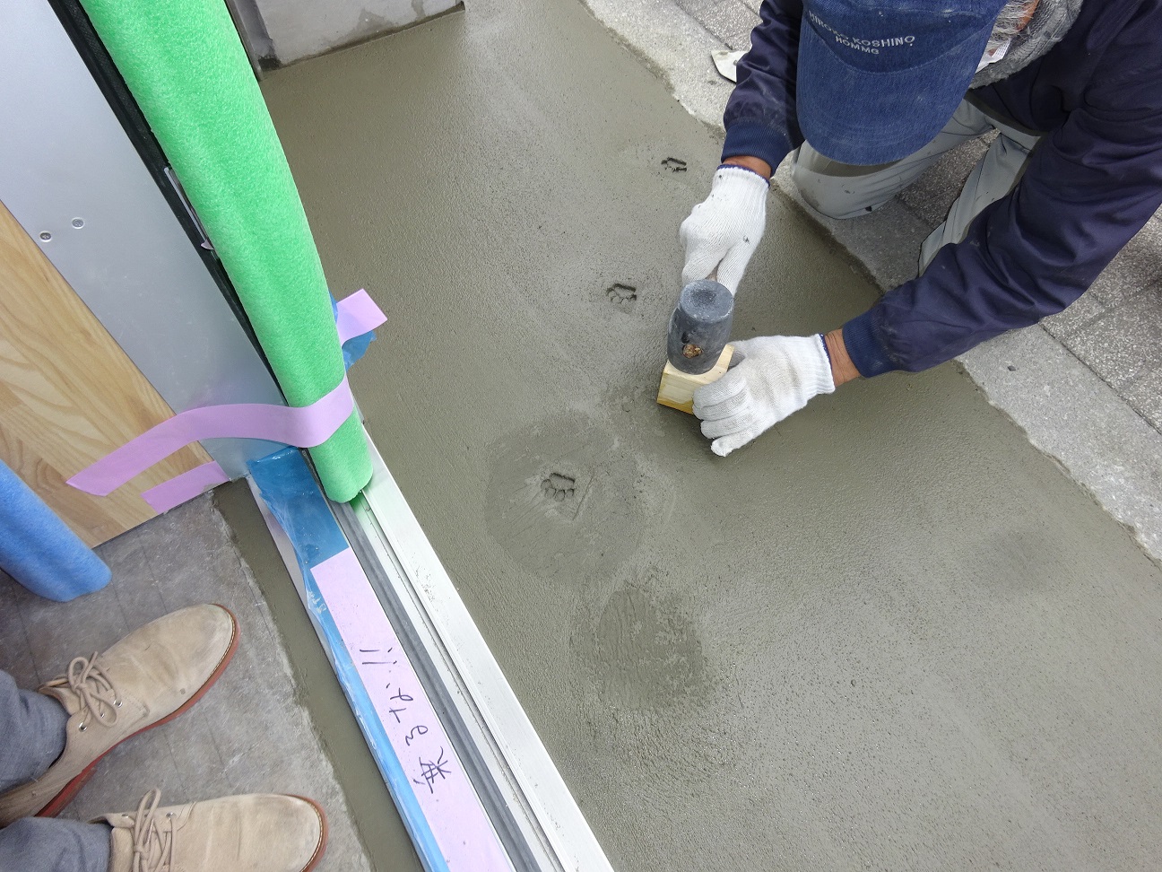 T邸です。 玄関の土間の施工中に猫が侵入しました。 というのは冗談で、左官屋さんに足跡をつけてもらいました。