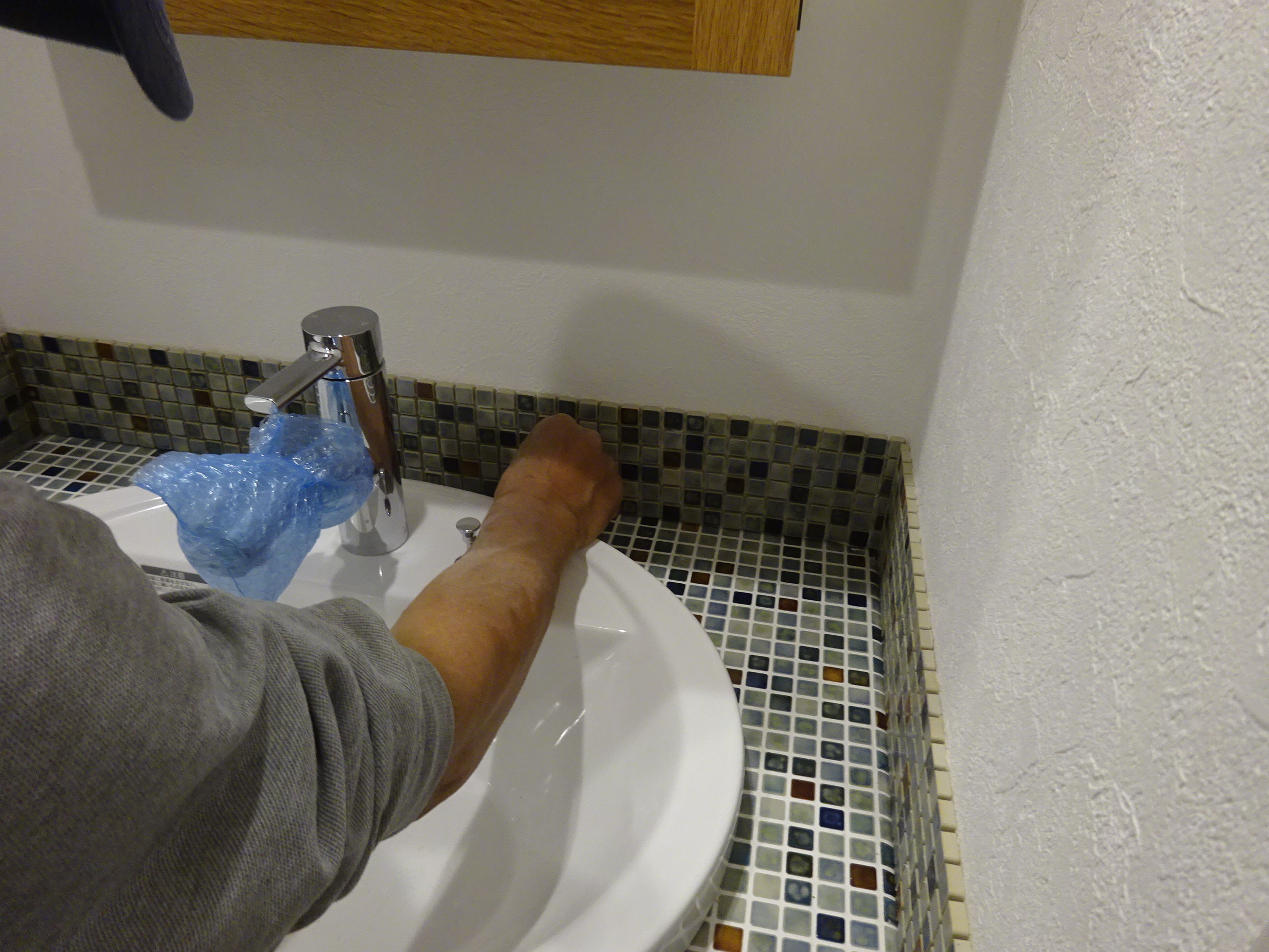 今回は、洗面台のタイル目地に合わせて1枚ずつ目地調整して貼りました。
