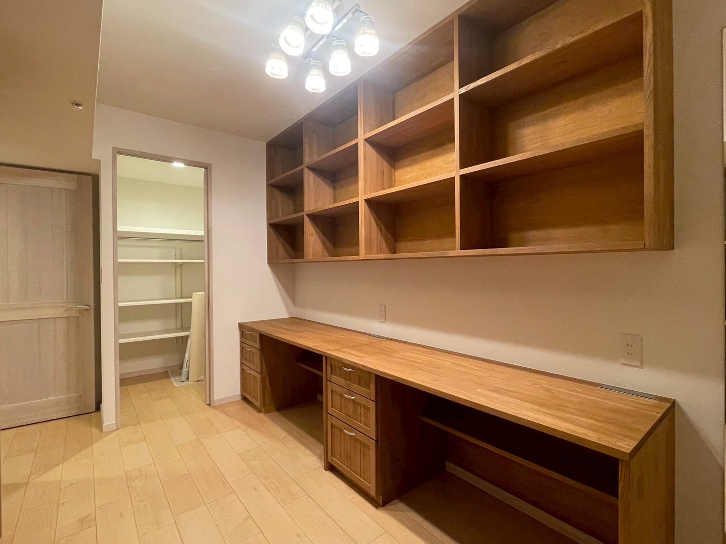 弊社オリジナル家具「LOHASmaterial」の家具を2台並べ、天板には集成材を使用して、引き出し付きの書斎デスクを造作しました。