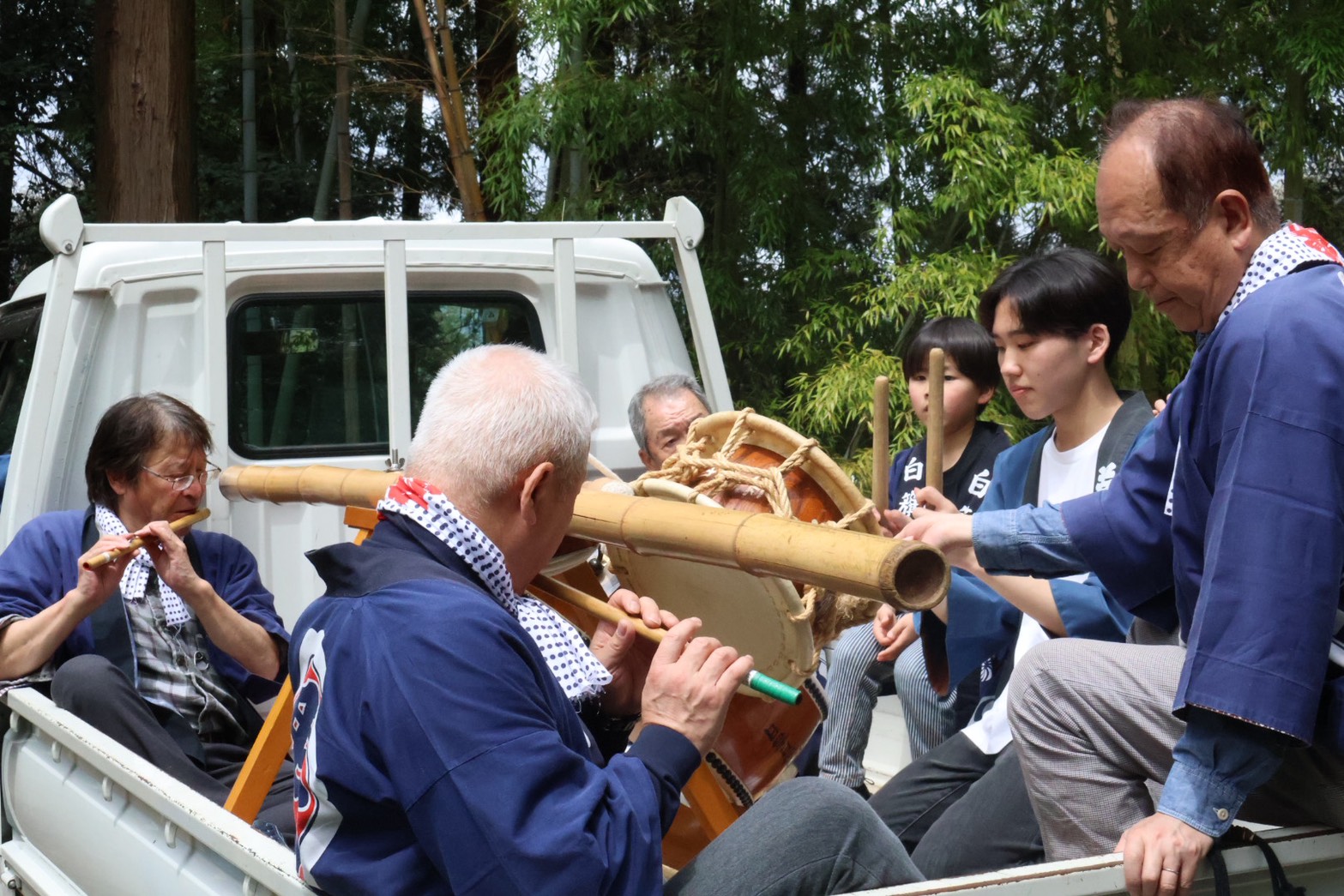 子供や女性は笛や太鼓でお神輿を応援してまた神社に戻るというお祭りです。