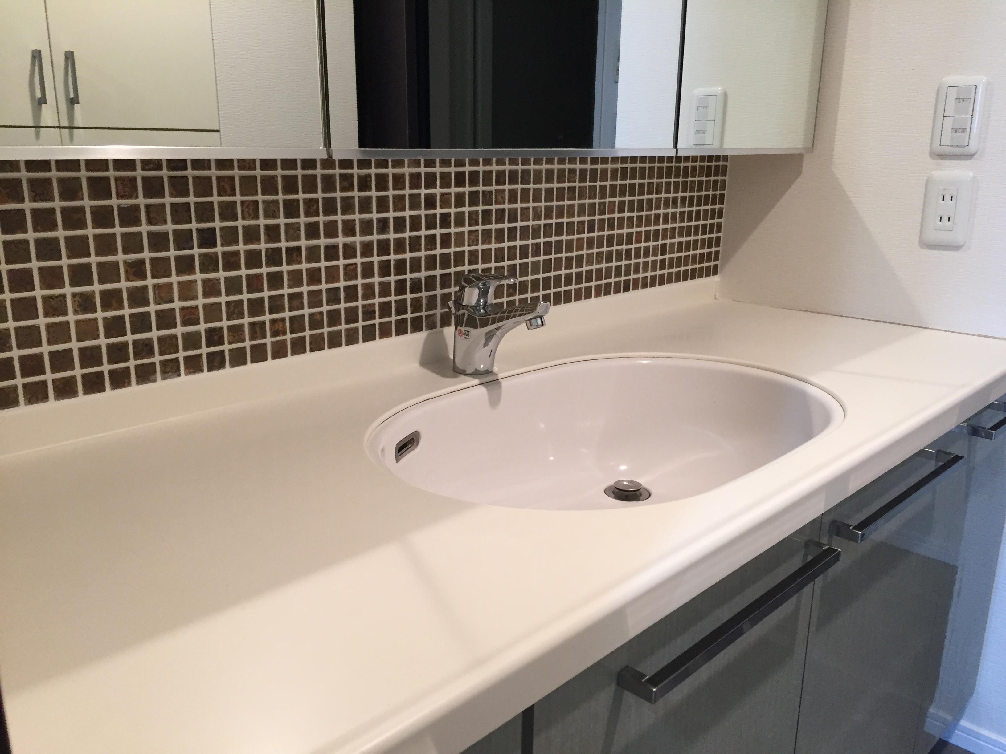 タイルを施工するだけでも随分綺麗な印象の洗面化粧台になりますよ(#^.^#)