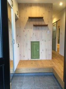 壁の板張りはパイン材でベージュブラウンというカラーのロハスオイルで着色しています。