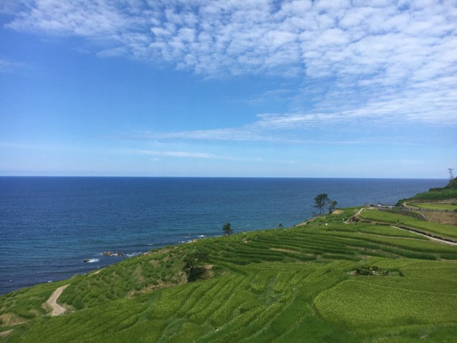 青い空と海、稲の緑の対比がとても綺麗でした。