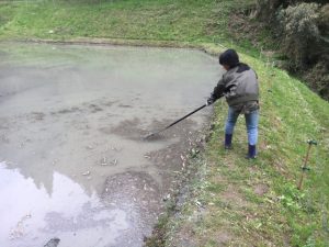 水面に浮かんでいる葉っぱなどのごみを取っています。