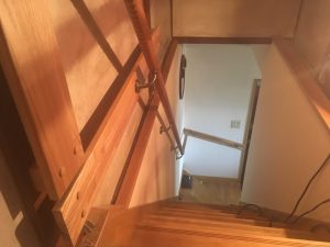 テープを張って、手摺の高さと、手摺受け金具が来る位置を墨出し、
