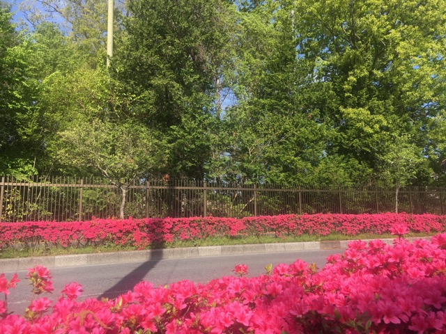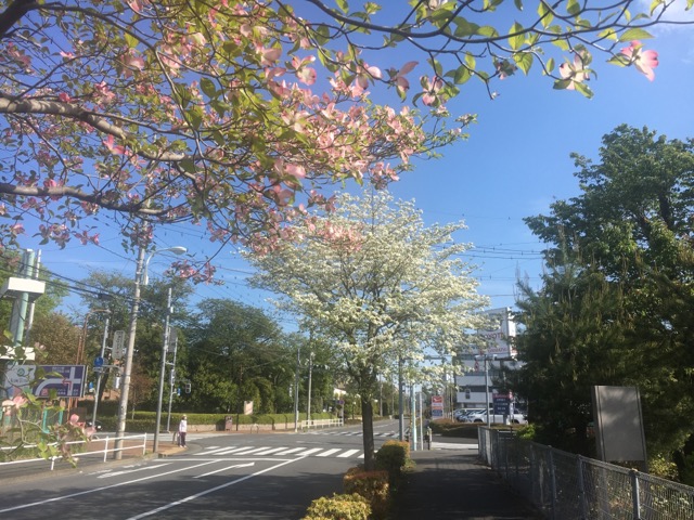 街路樹のハナミズキの花も赤白キレイに咲いています。