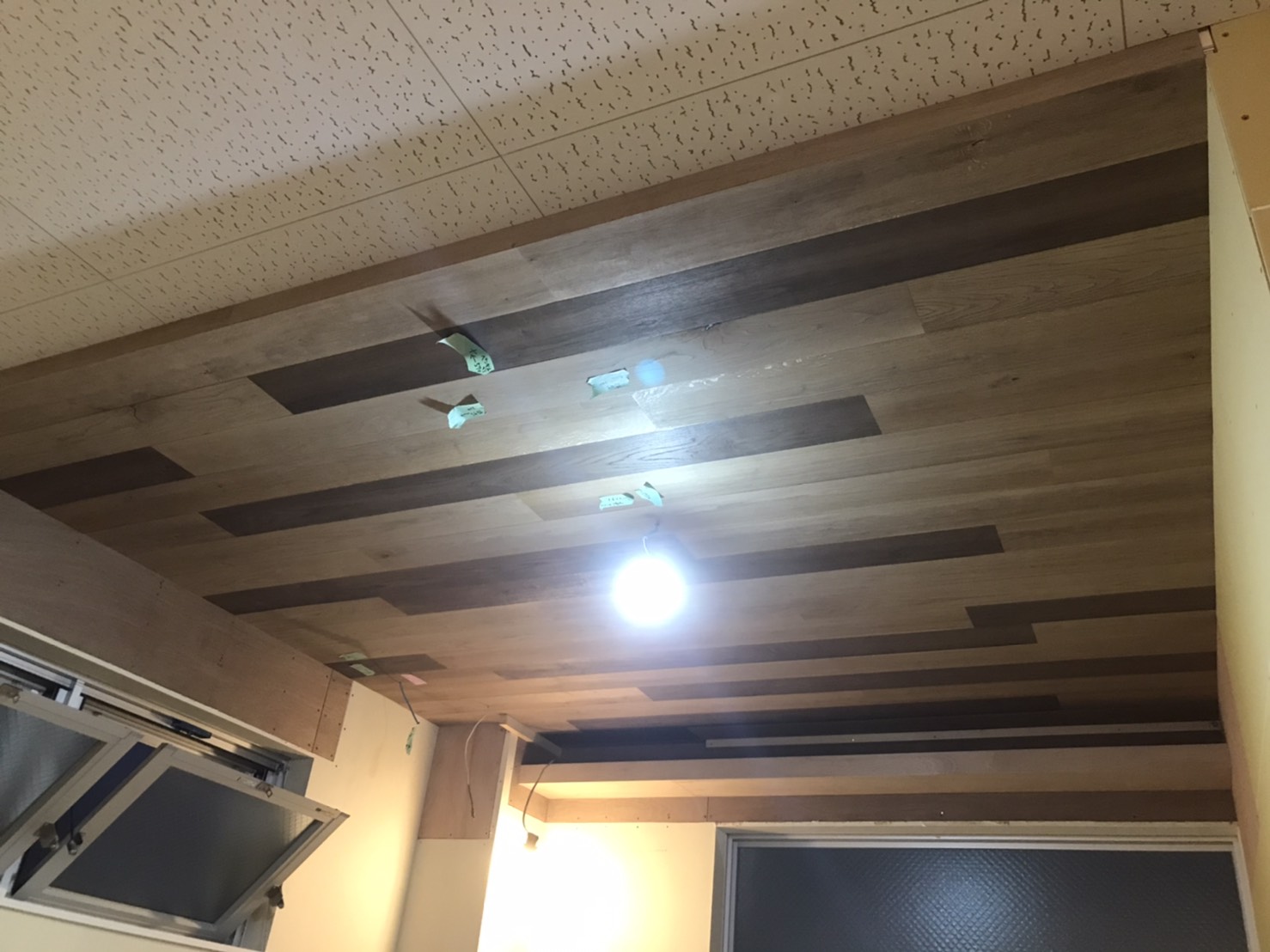 材料を床に並べてみるより、天井に貼った方が濃い色はより濃くなる感じがしました。