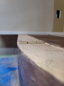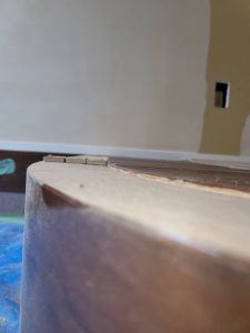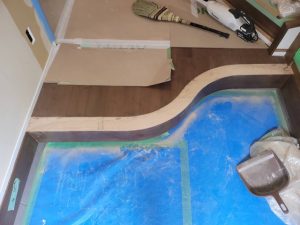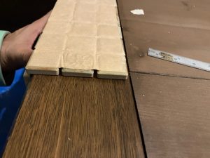 タイルを載せてるのが既存の框、右側が新しく貼ったフローリング、