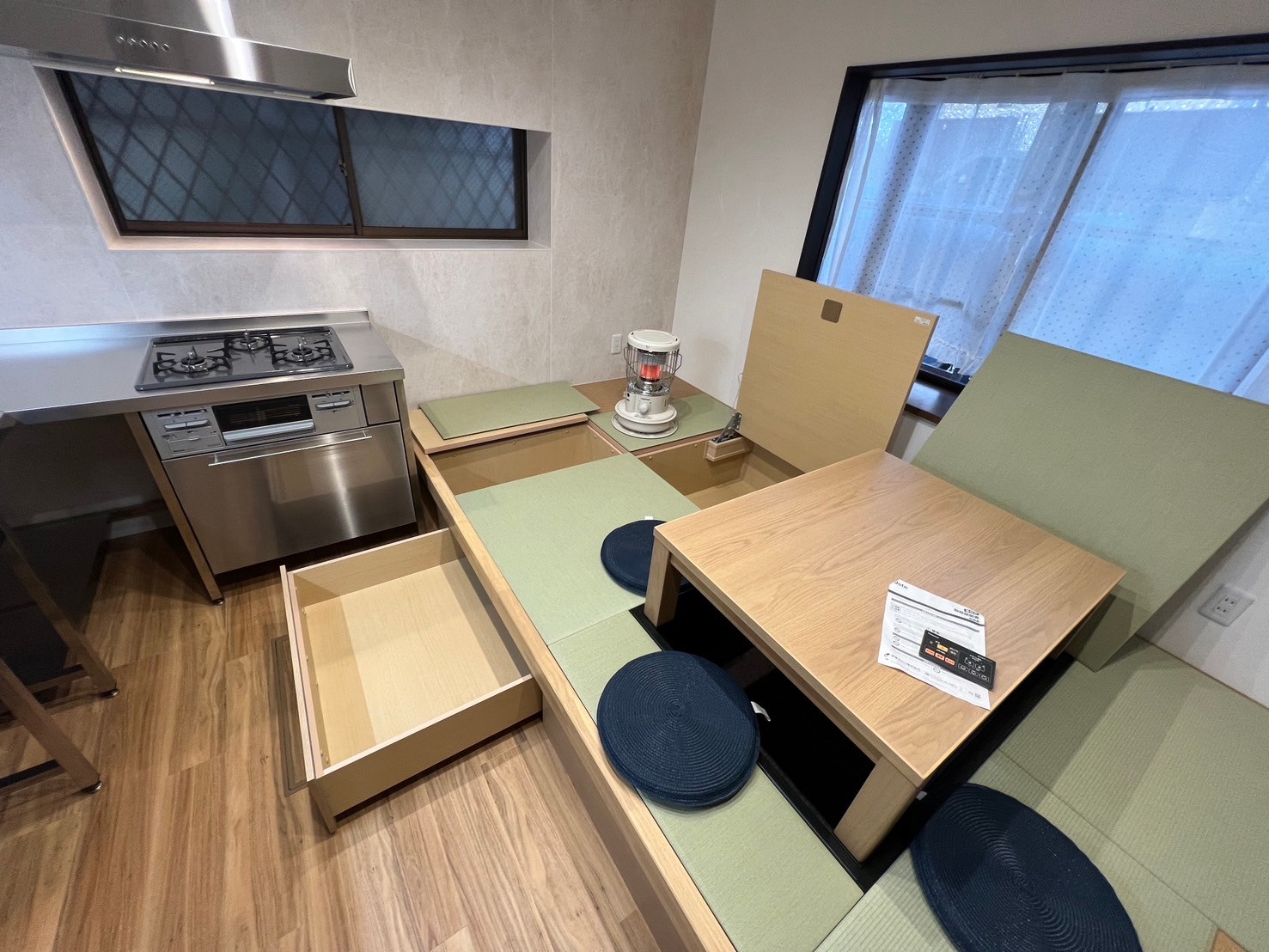 小上がり部分の収納と堀こたつ(黒い囲み)を組み立てています