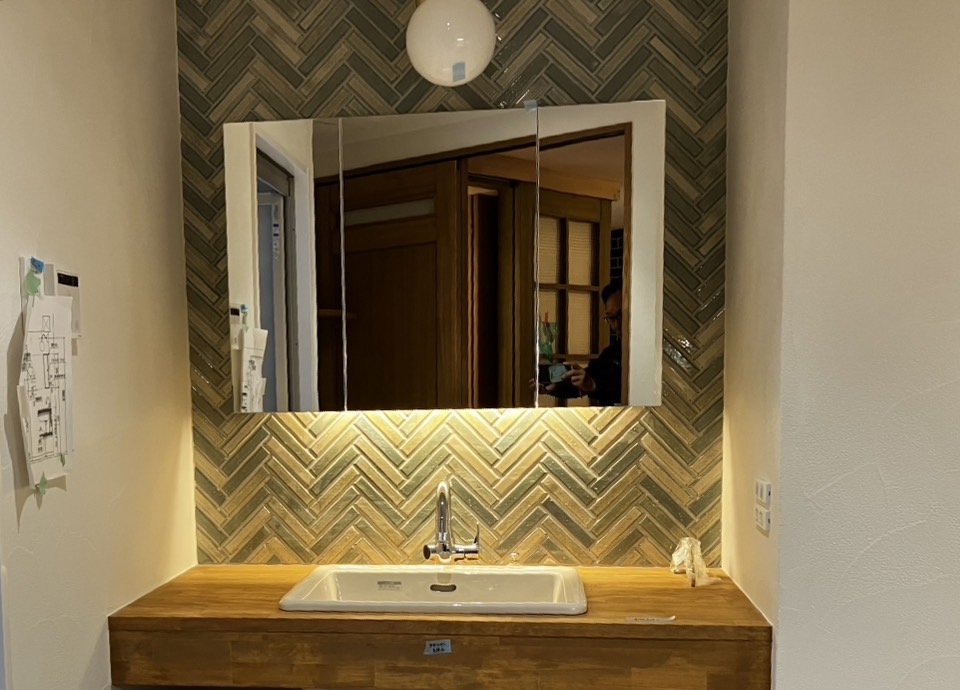 こんにちは 造作洗面台に設備器具がつきました タイルが印象的ですね