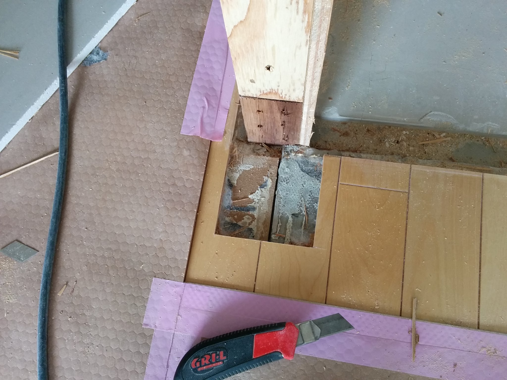 まず、柱を立てる下の部分のフローリングを欠き込みました。