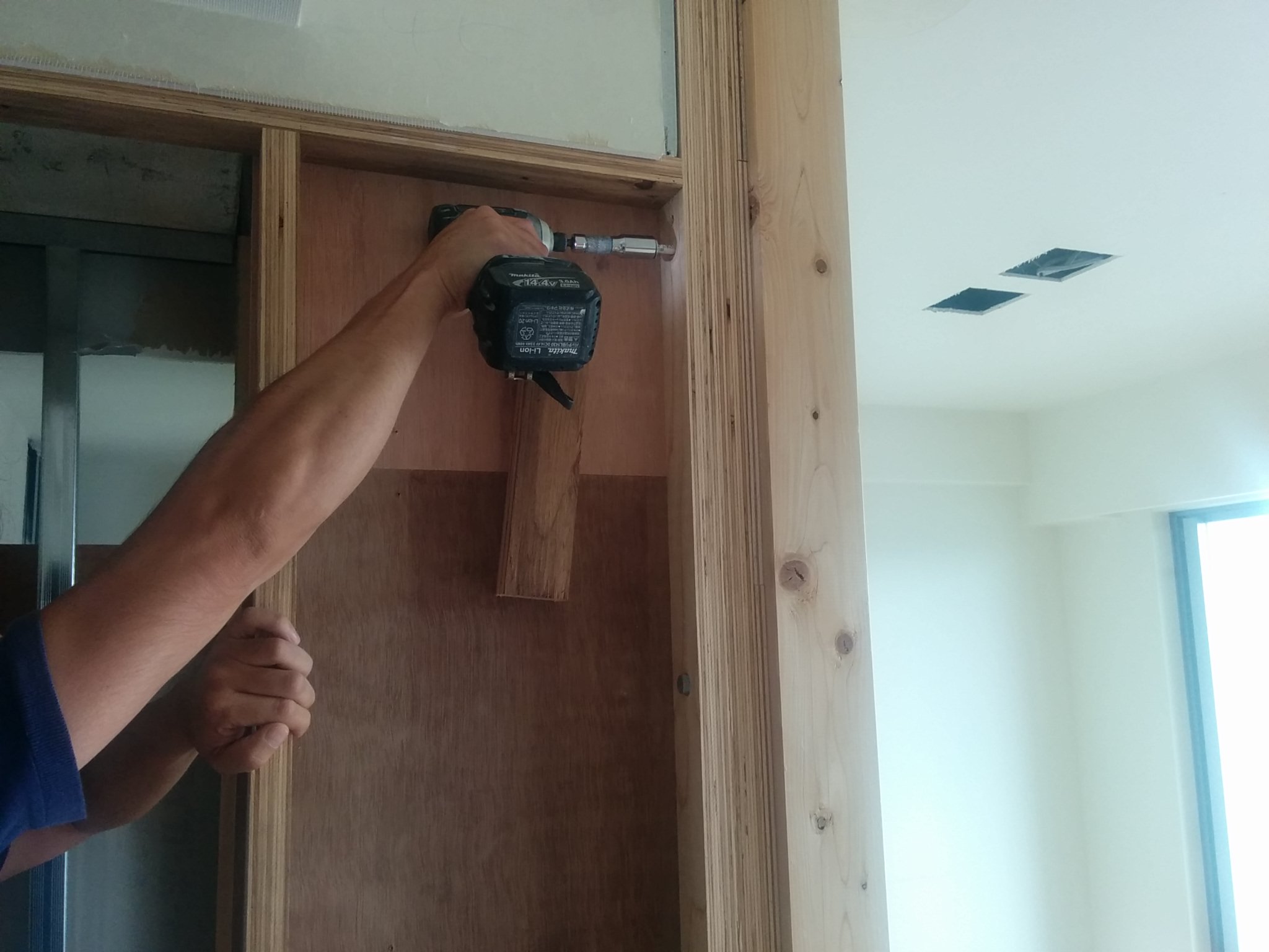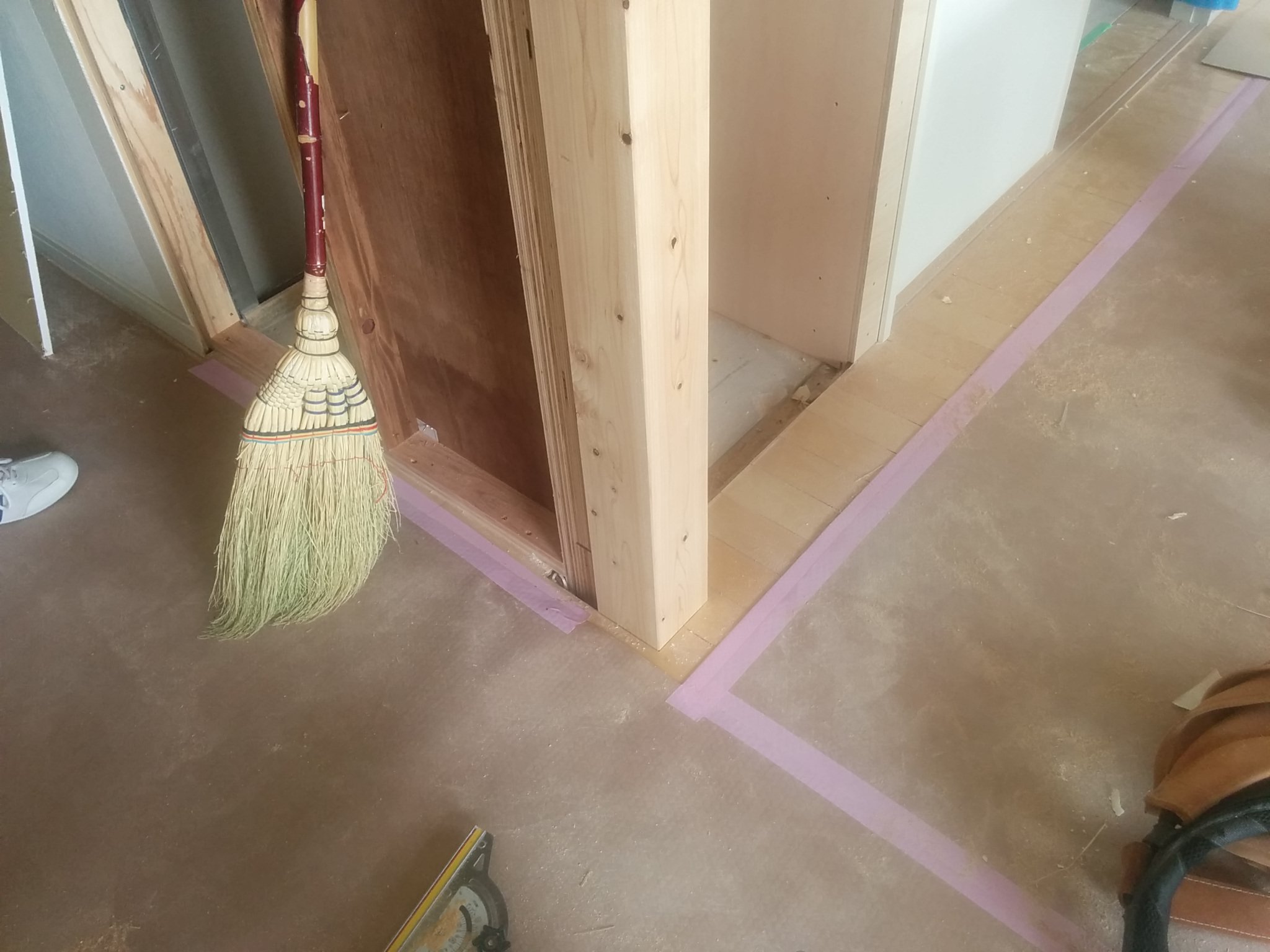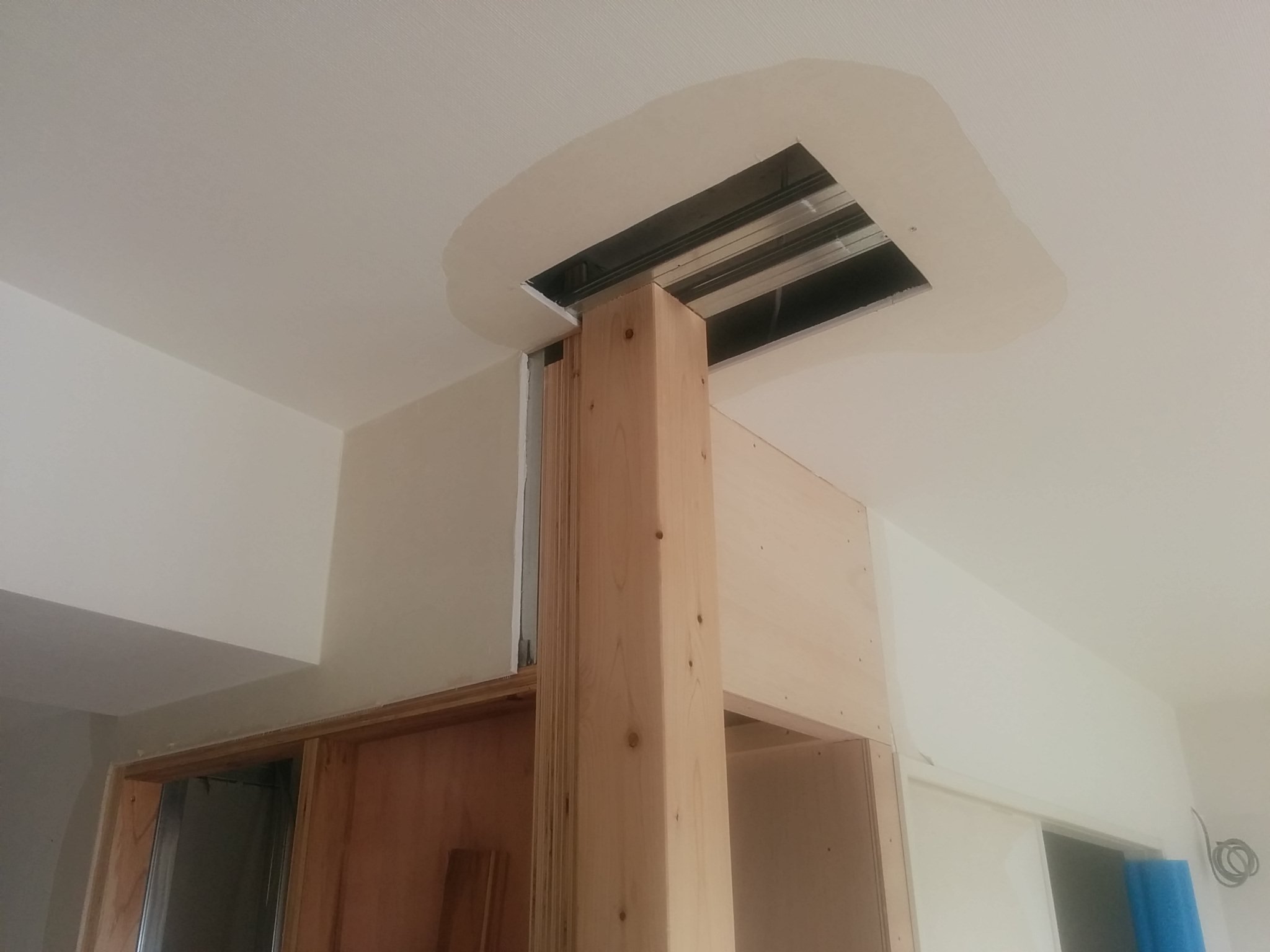 収納も造り変えたので間仕切り壁も木の軸に作り変えました。