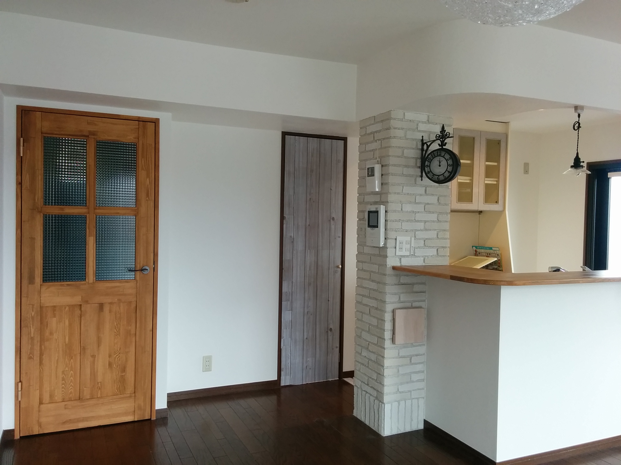 施工前のパイプシャフト(右)、リビング入口扉も無垢の扉に変えています。