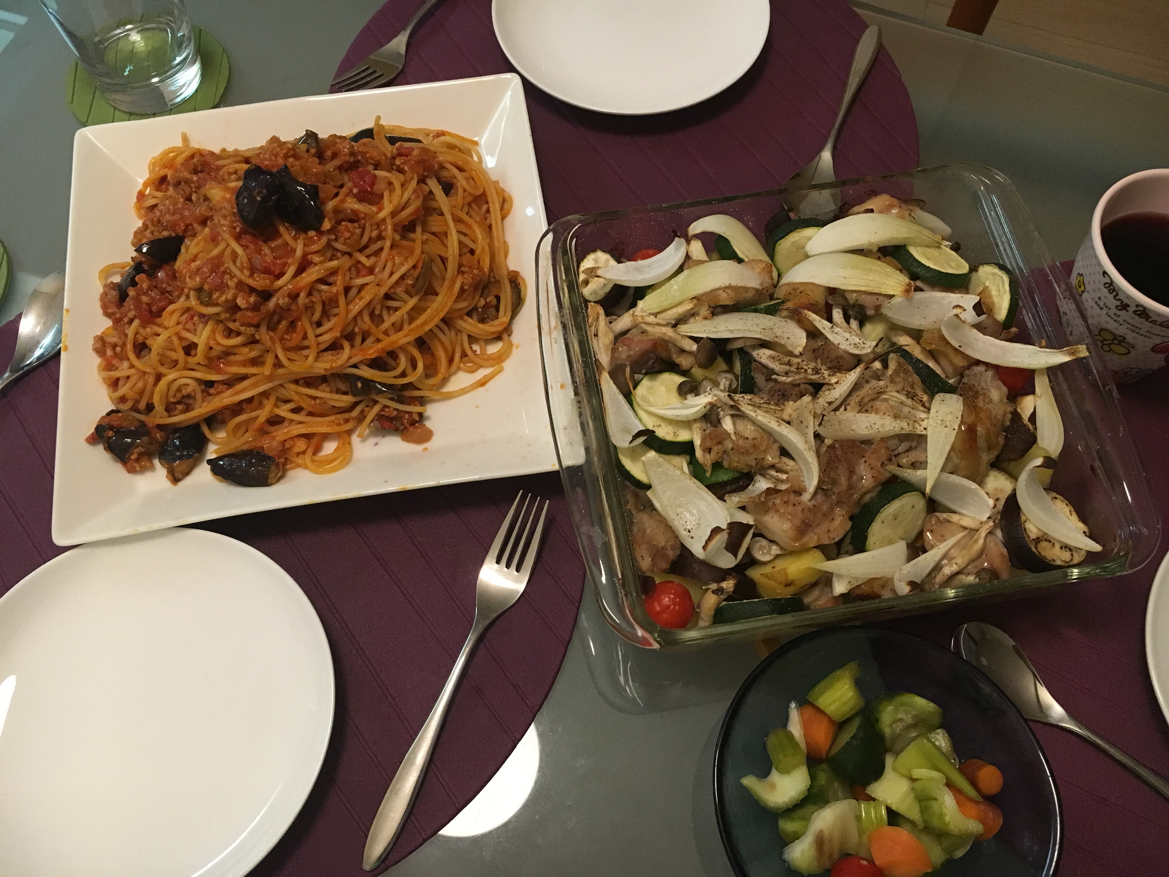 ナス・トマト・ひき肉のパスタ&チキンと夏野菜のオーブン焼き