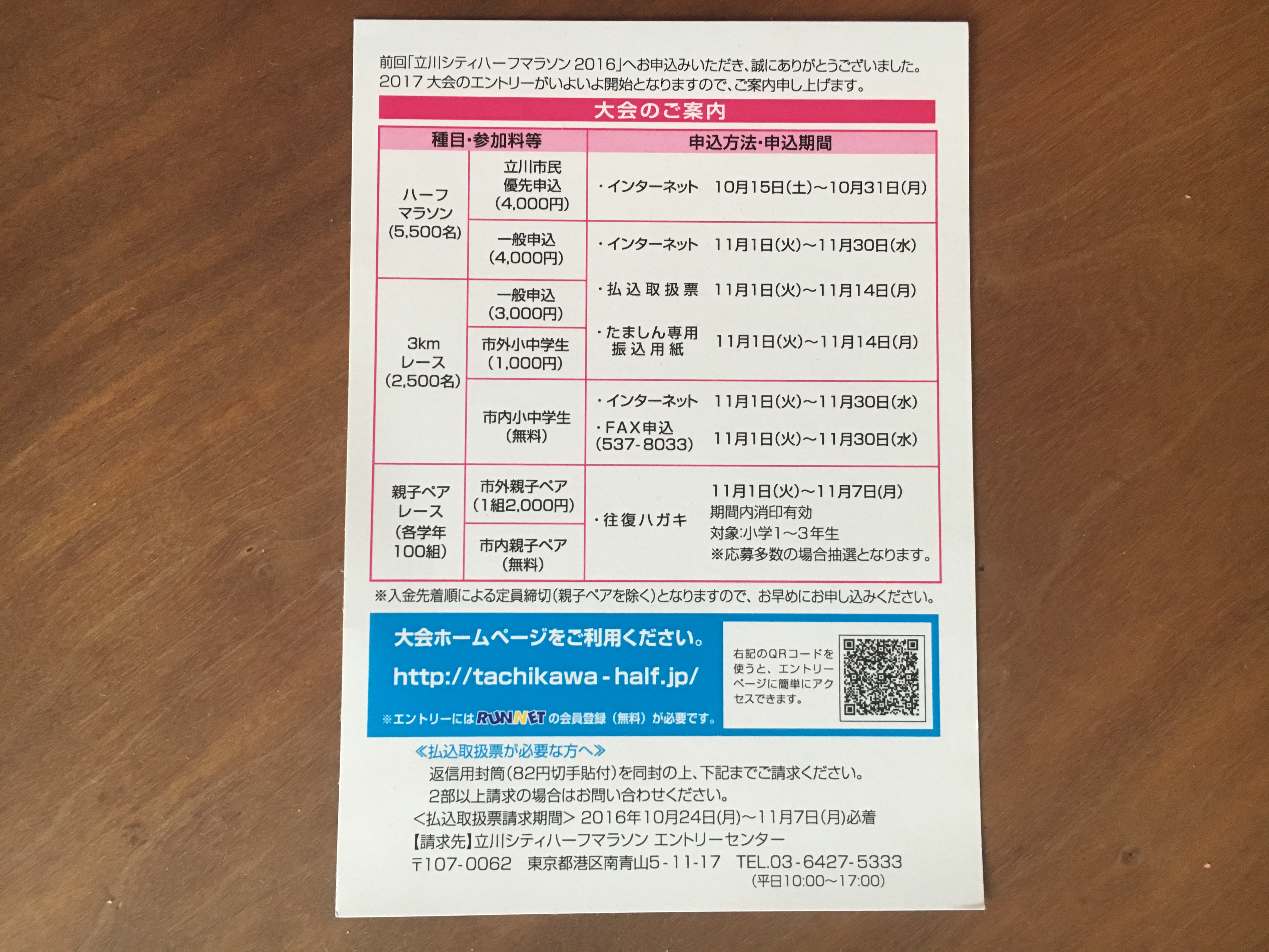 昨年も参加した立川市のハーフマラソン大会からの案内です。
