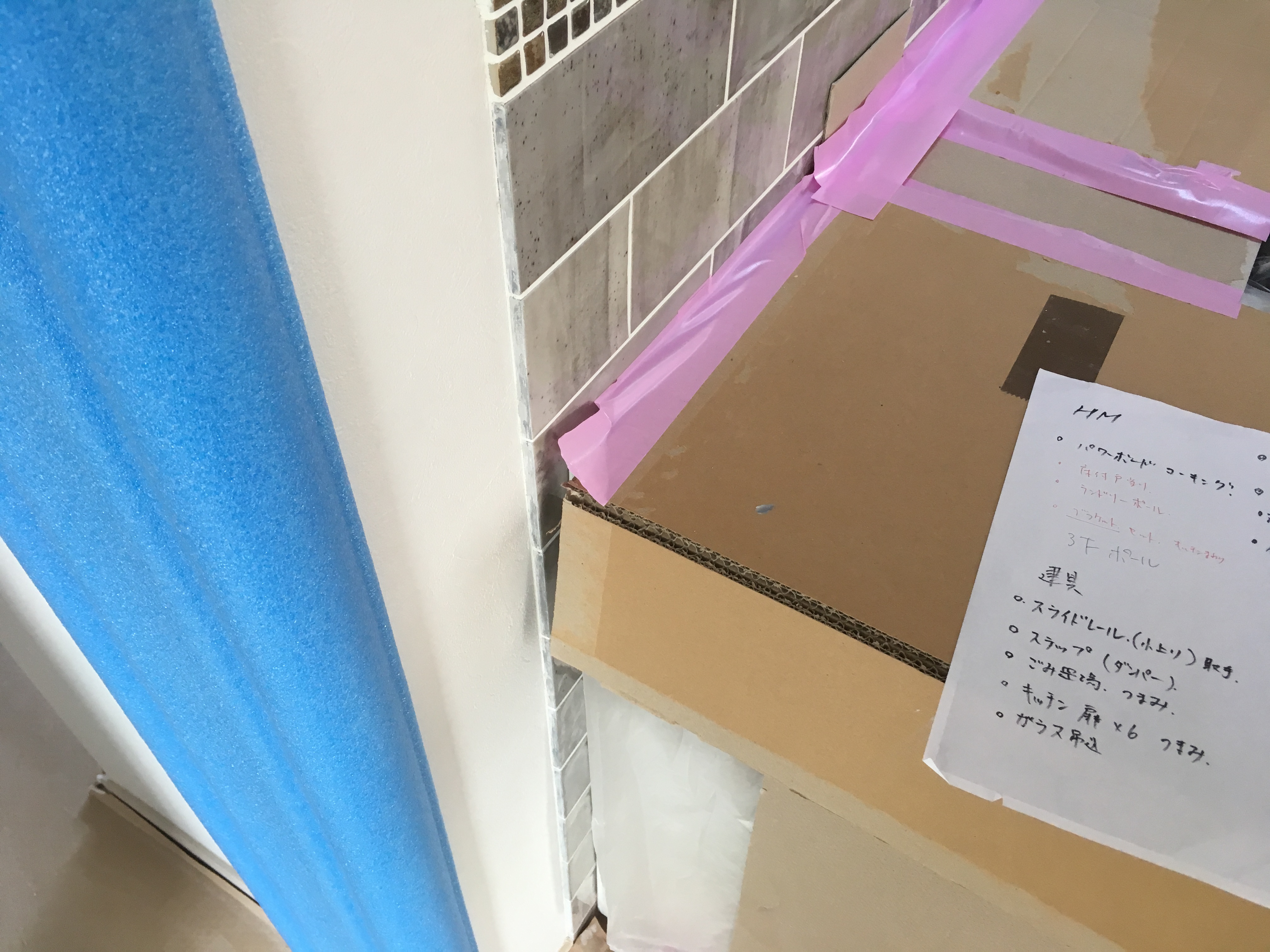 角の白いのはオレンジ色の部分にシーラー(下塗り)を入れてるところです。