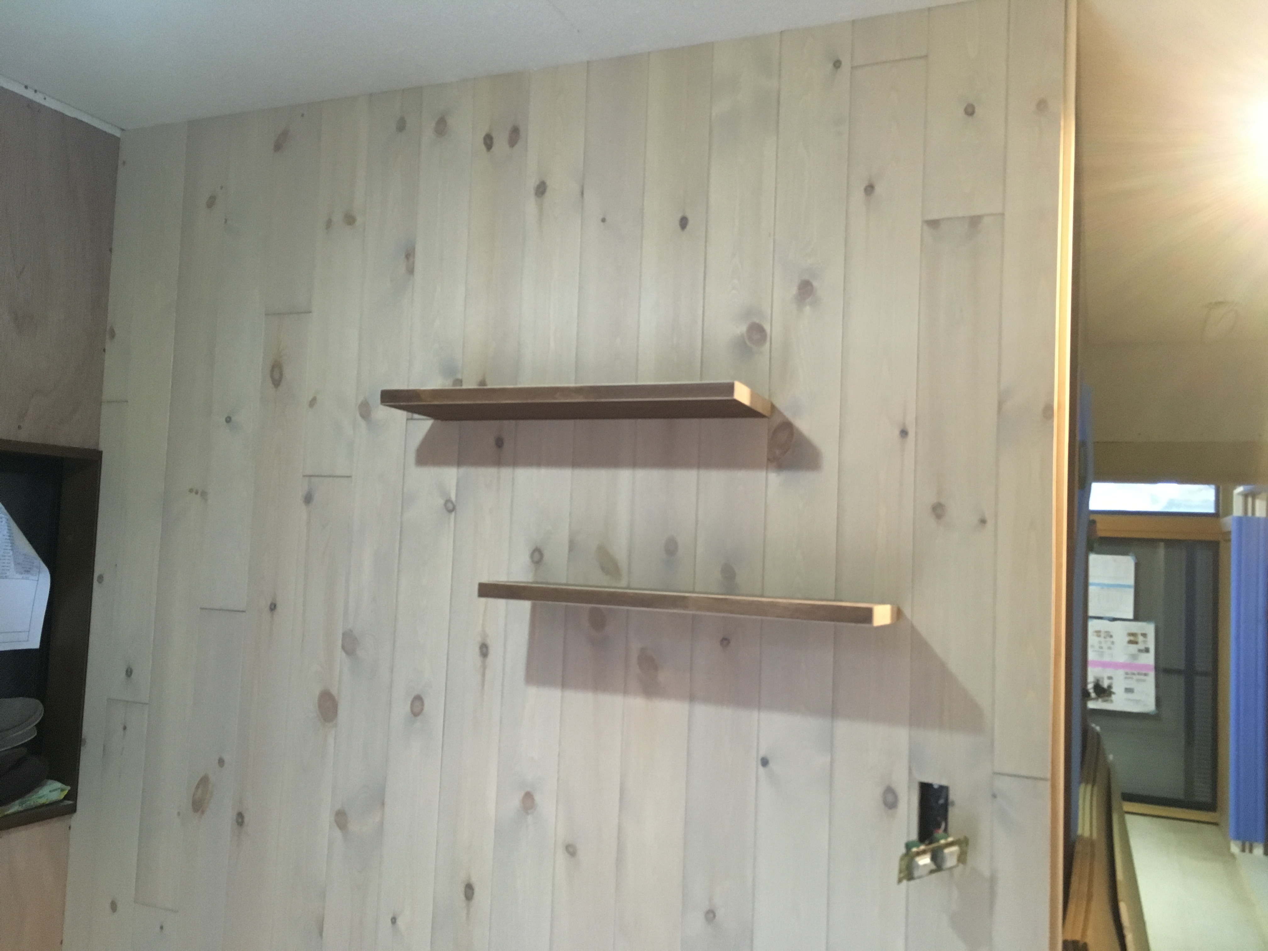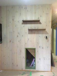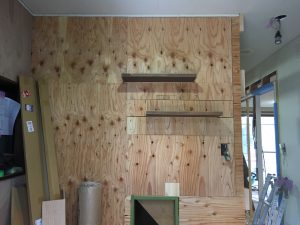 壁にフローリングを貼るために下地となるベニアを貼ります。