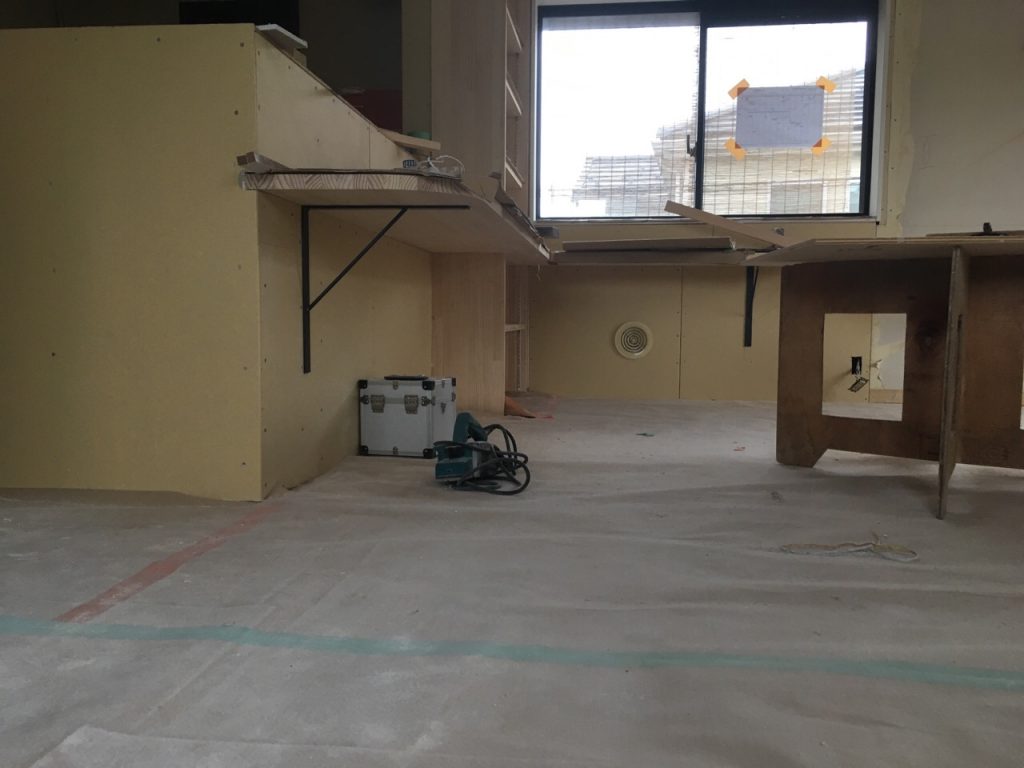 本日はミシンの作業テーブルを造作しております。 キッチンの窓の側なのでとても明るそうです。 これから塗装工事になっていきます。