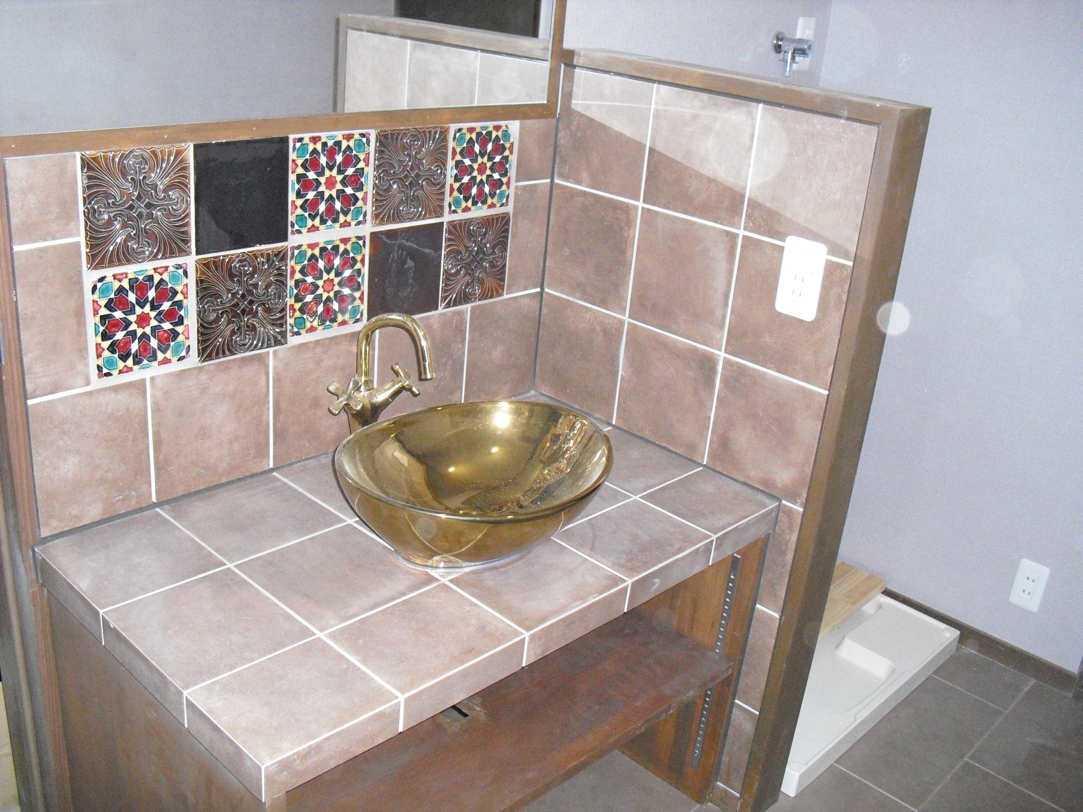 ゴールドの洗面ボールとタイルの色合いがうまくマッチしてると思いませんか?