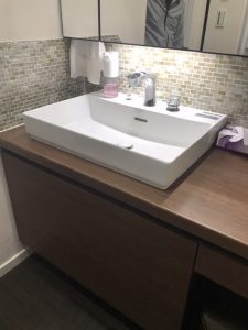 洗面化粧台のタイルにはガラス製のタイルを施工しております。