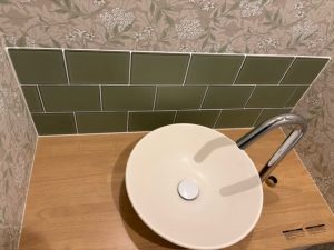 こんにちは! OKUTA世田谷店の浅子です! トイレの手洗い器にタイルを施工しました。 緑のタイルが素敵なクロスに映えてきれいに仕上がりました!...