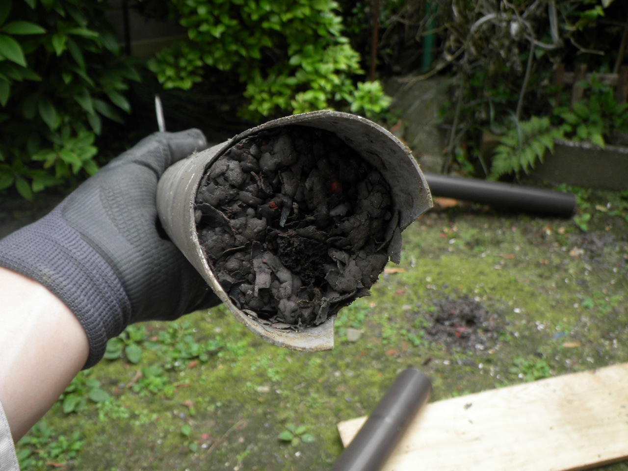 凄いですね!竪樋にぎっしりと何かが詰まっています。
