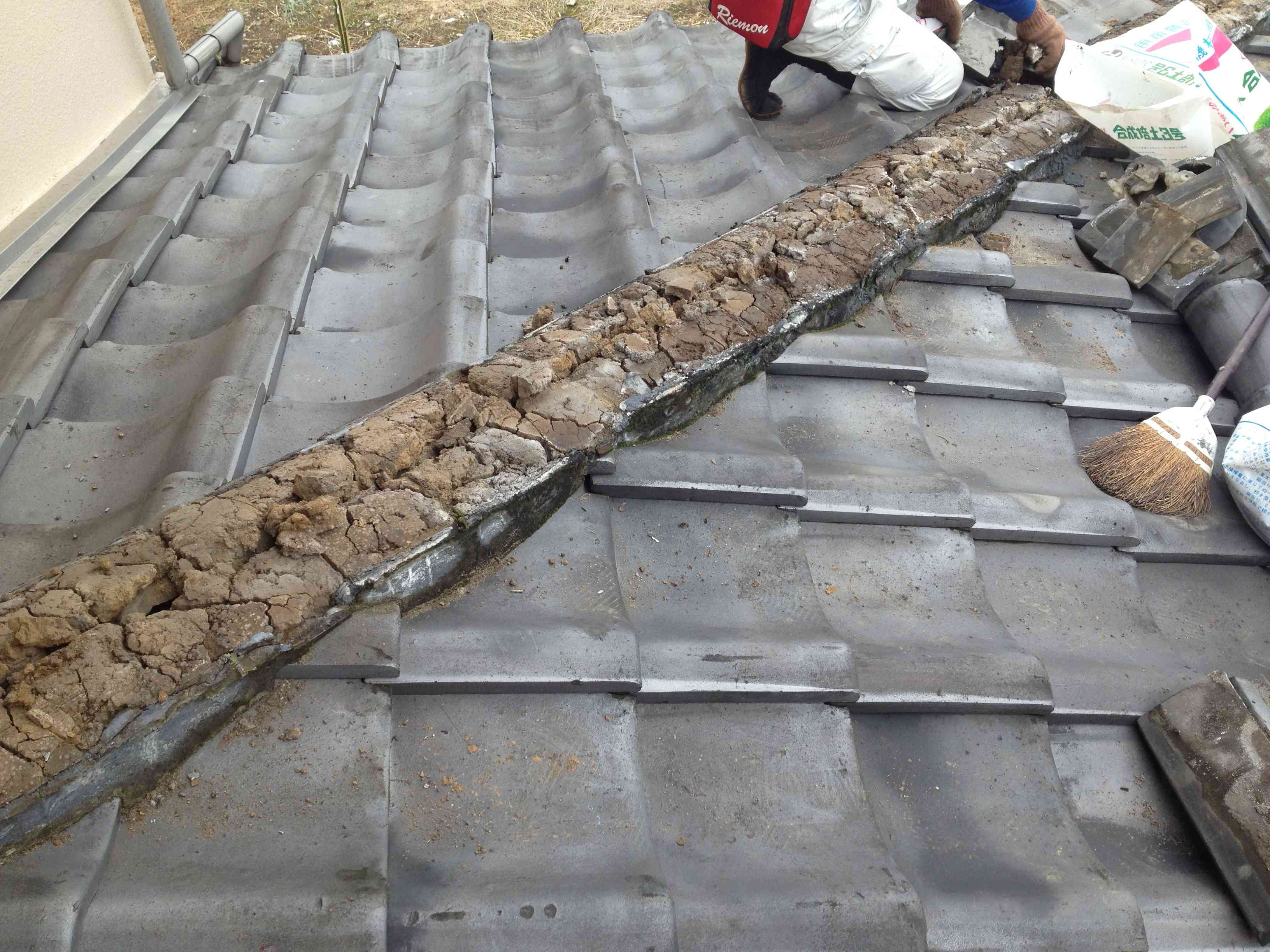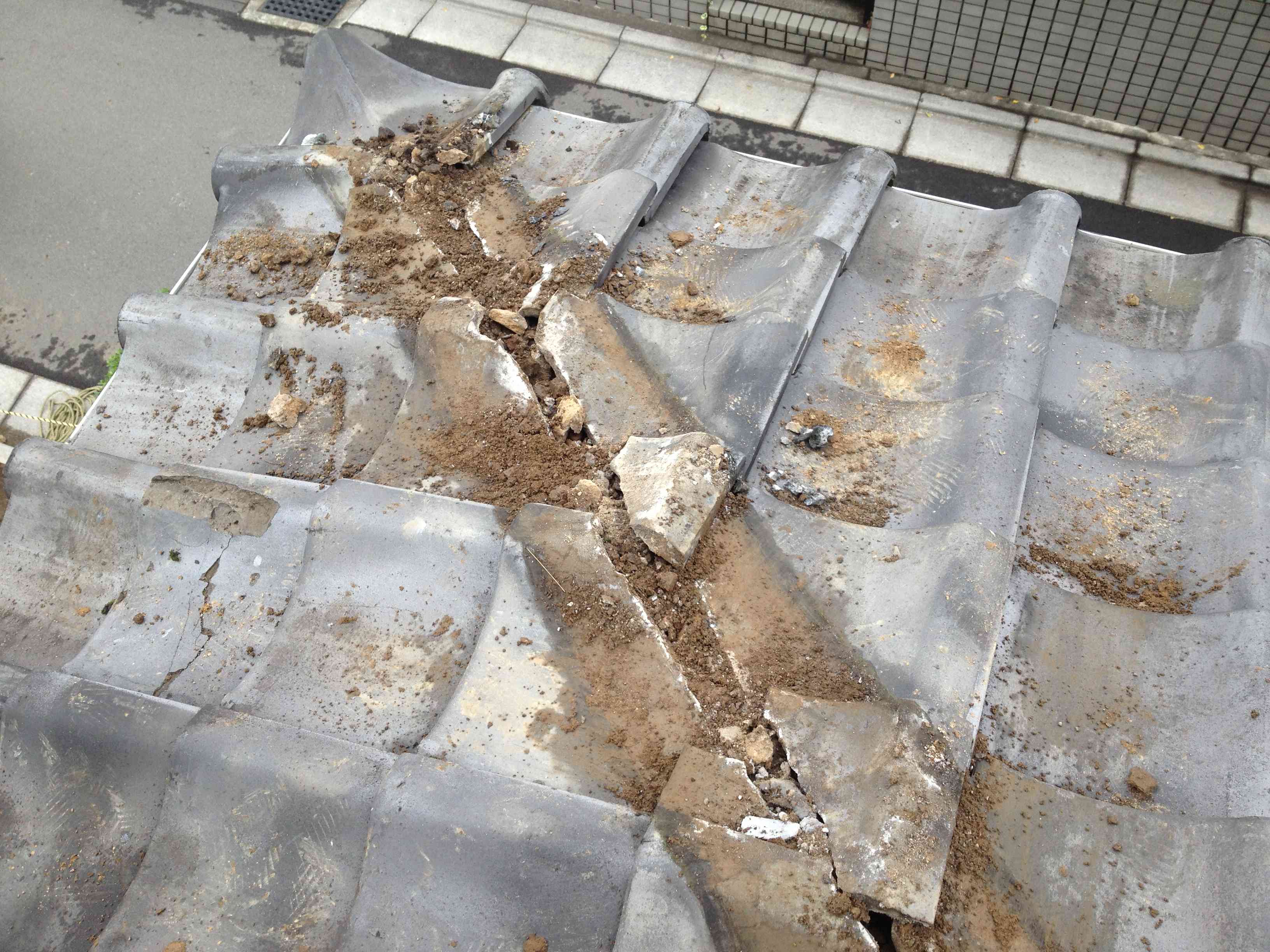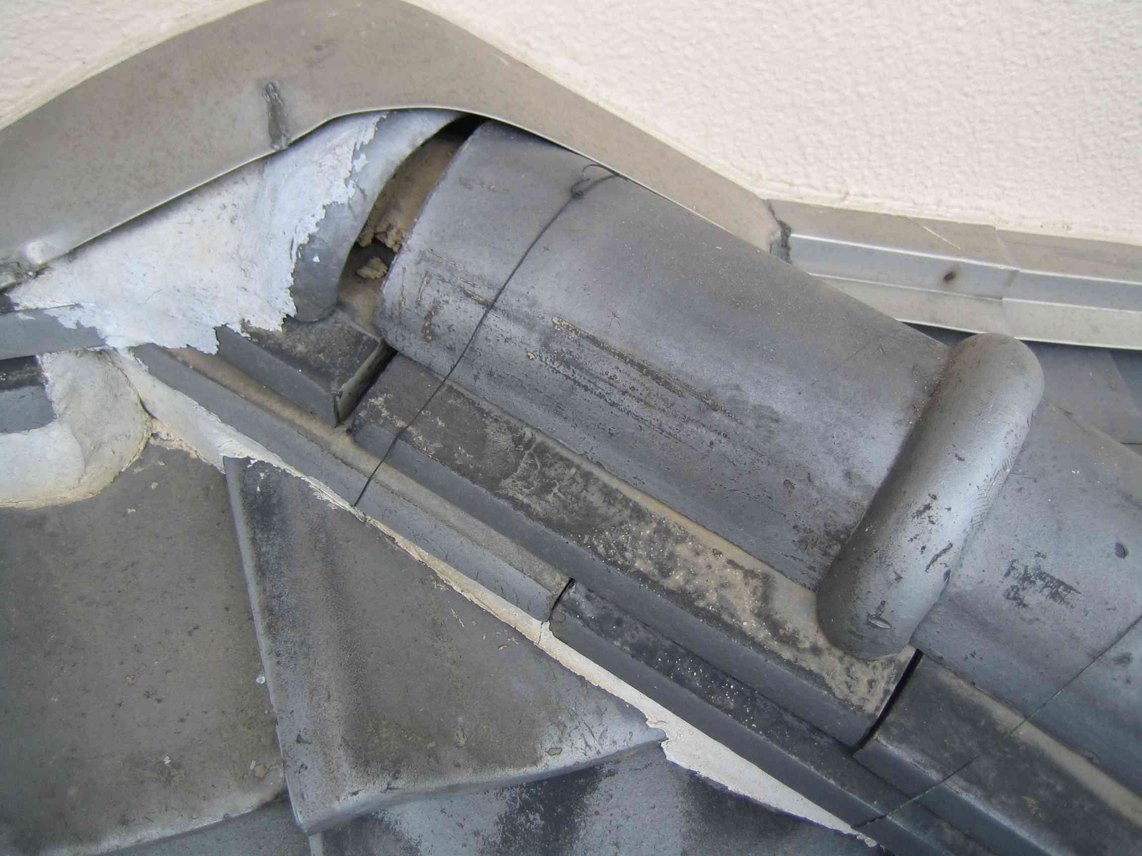 上方からズレ落ちている影響で鬼瓦も傾き、のし瓦下部の漆喰が剥がれ、内部の土が露出しています