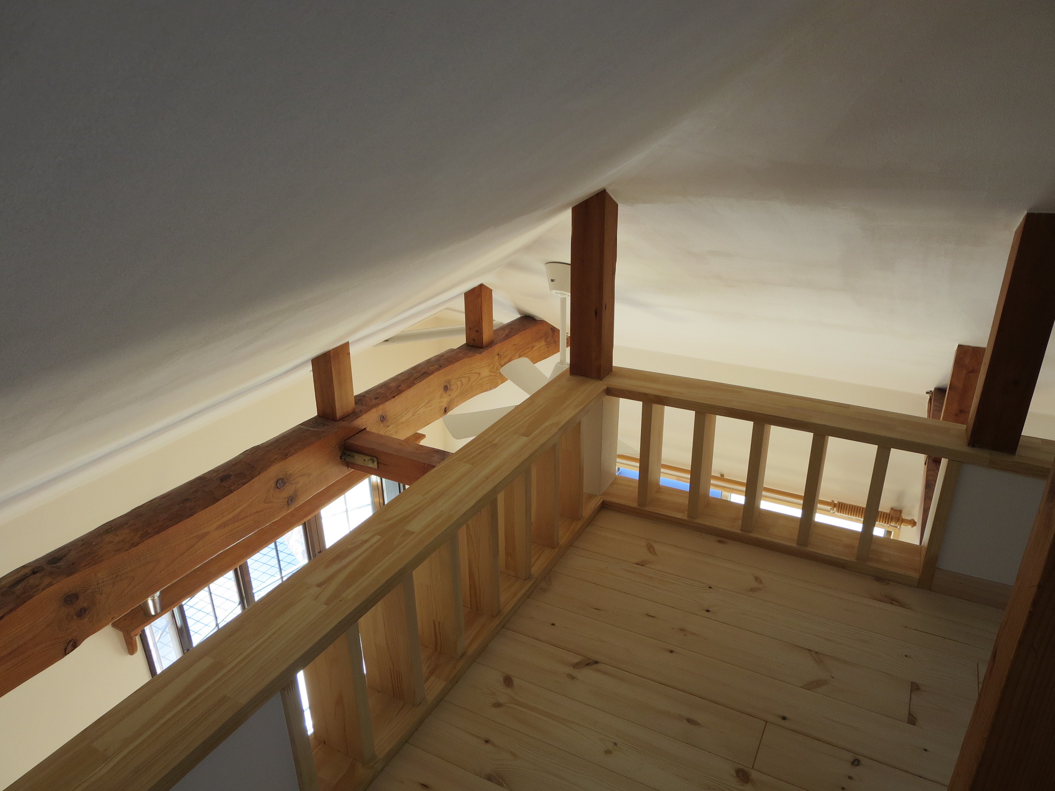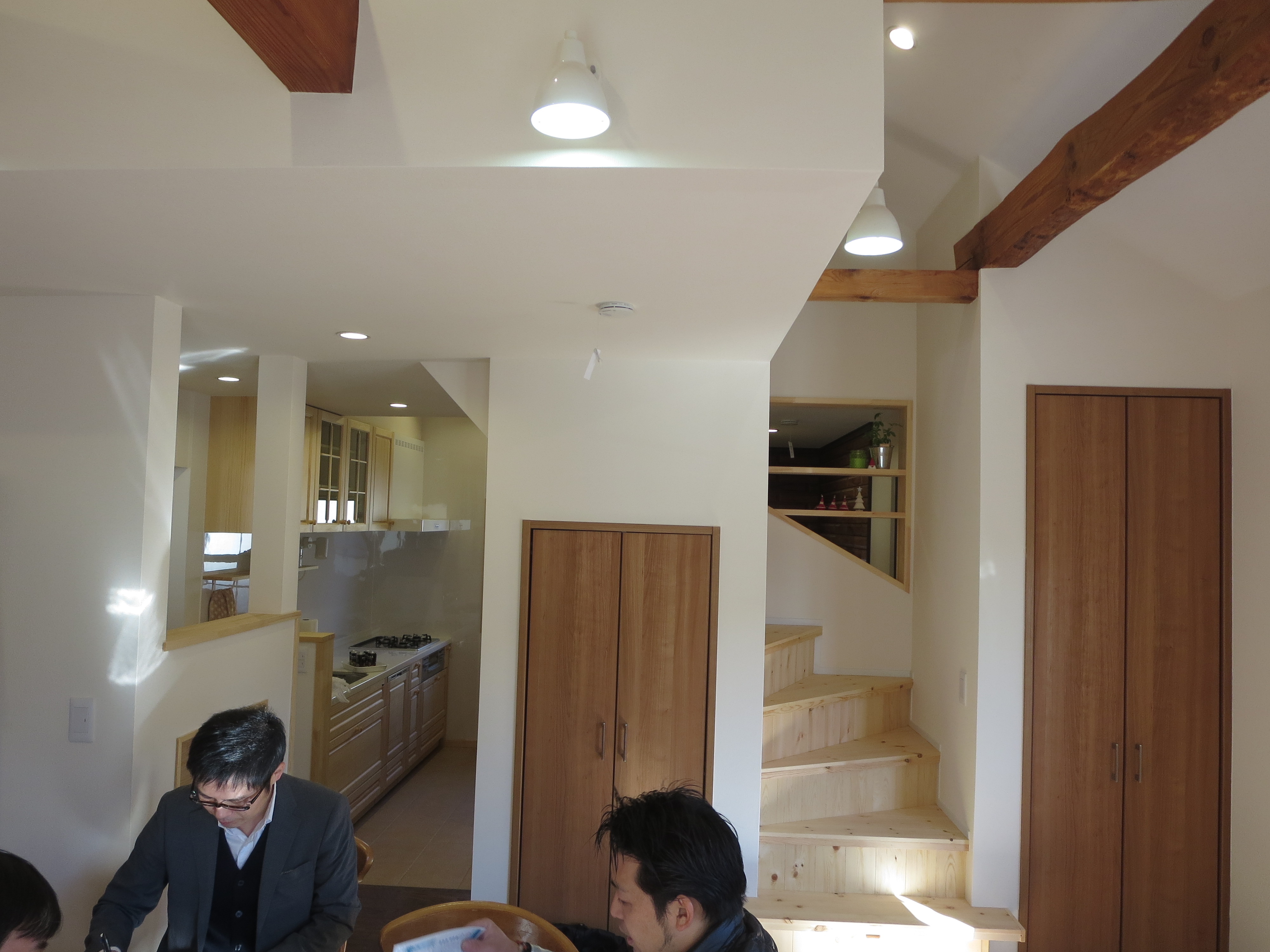 階段上がって そのまま続くLDK へ 、さらに小屋裏へとドアを設けない ひと続きの空間となりました。