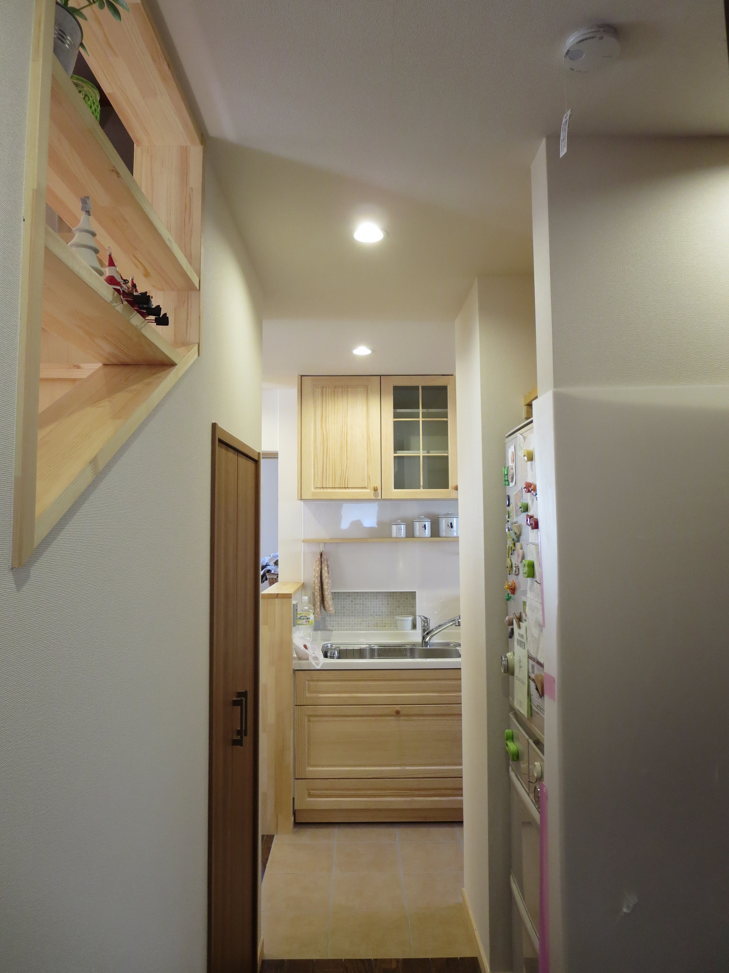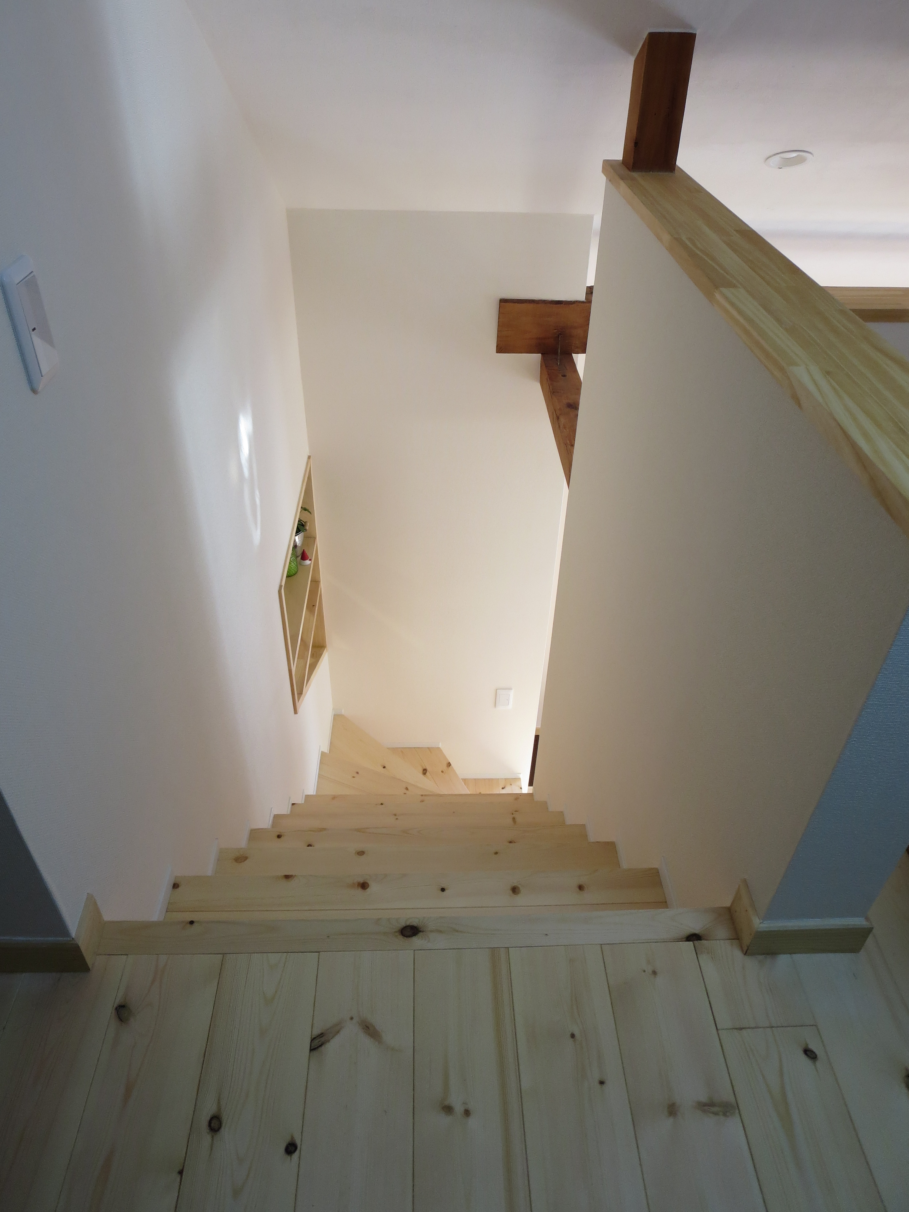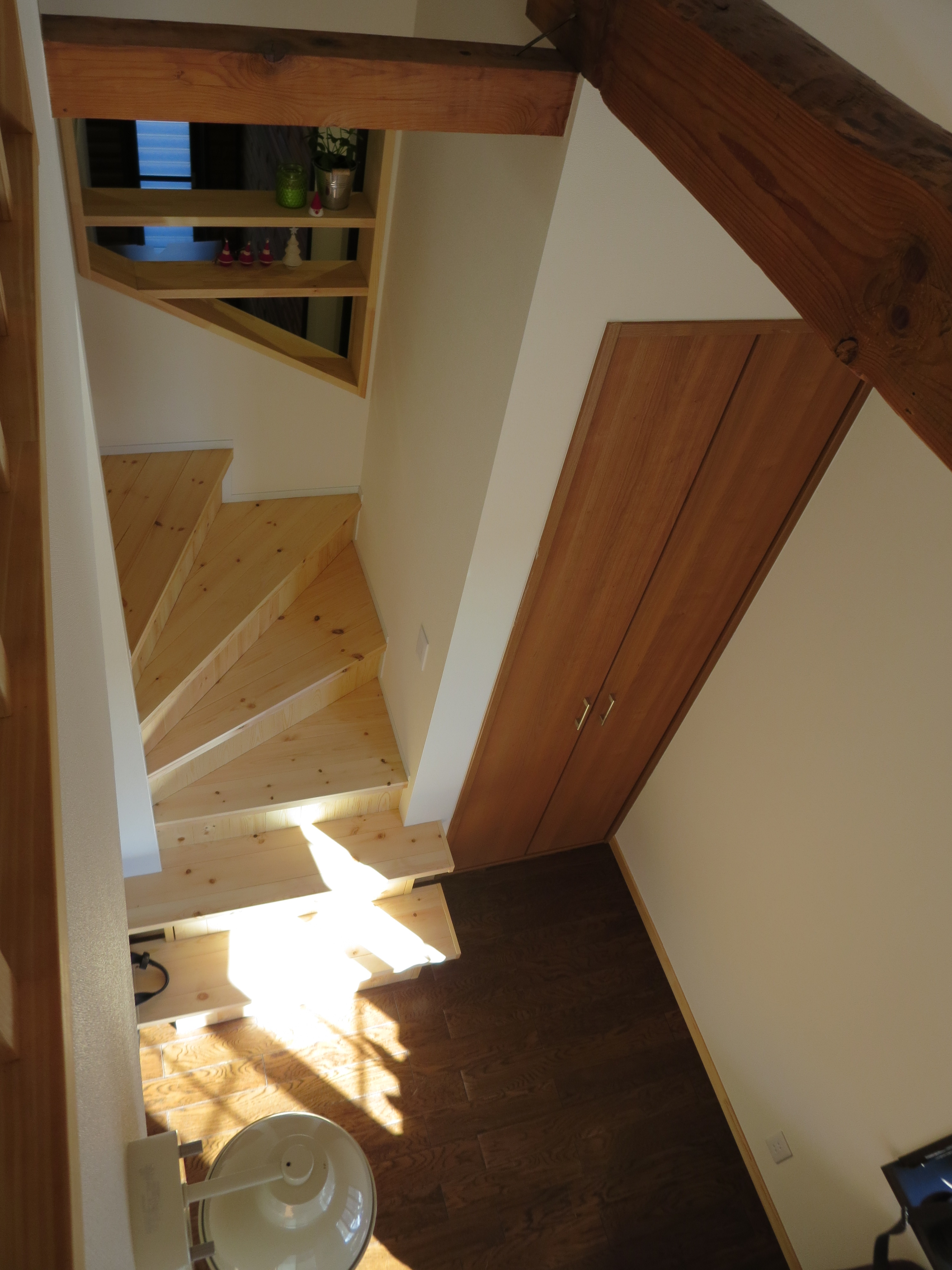 2階へと、 階段上がると廊下にキッチン。 小屋裏階段を設けたことで、リビングへクランクする壁