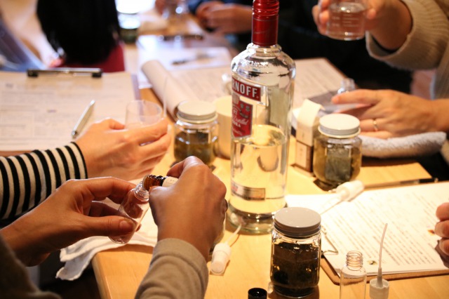 続いてワークショップでは、ドライハーブとウォッカ片手に、スタジオコーディネーターがこの季節ならではのハーブ効能を