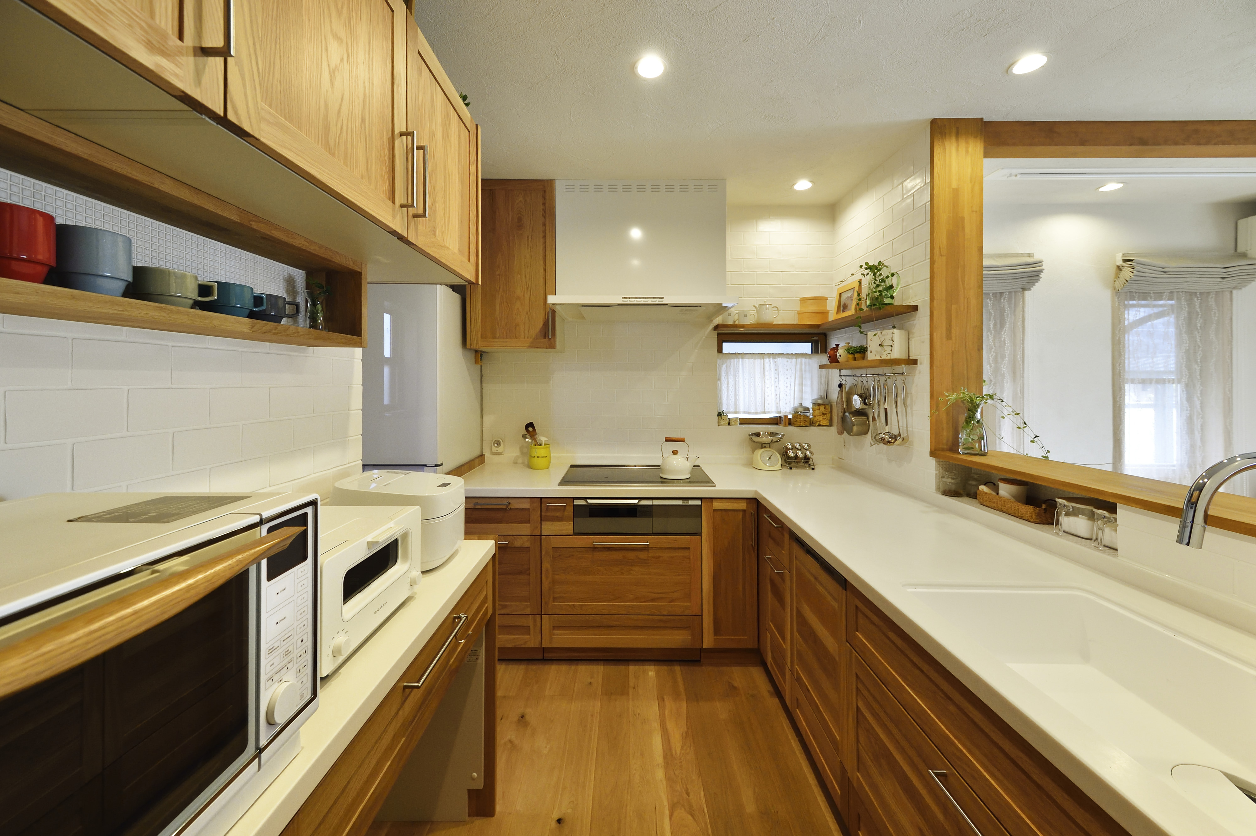 ホワイトカラーで質感合わせたキッチンタイルで揃えました。