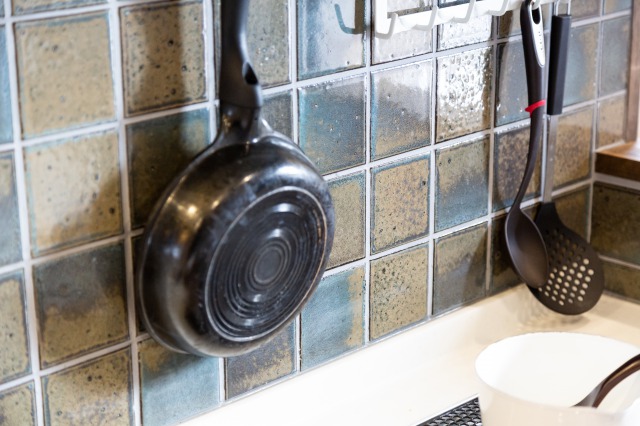 熟練技で焼き上げたタイルが、「男性的」なキッチンとして